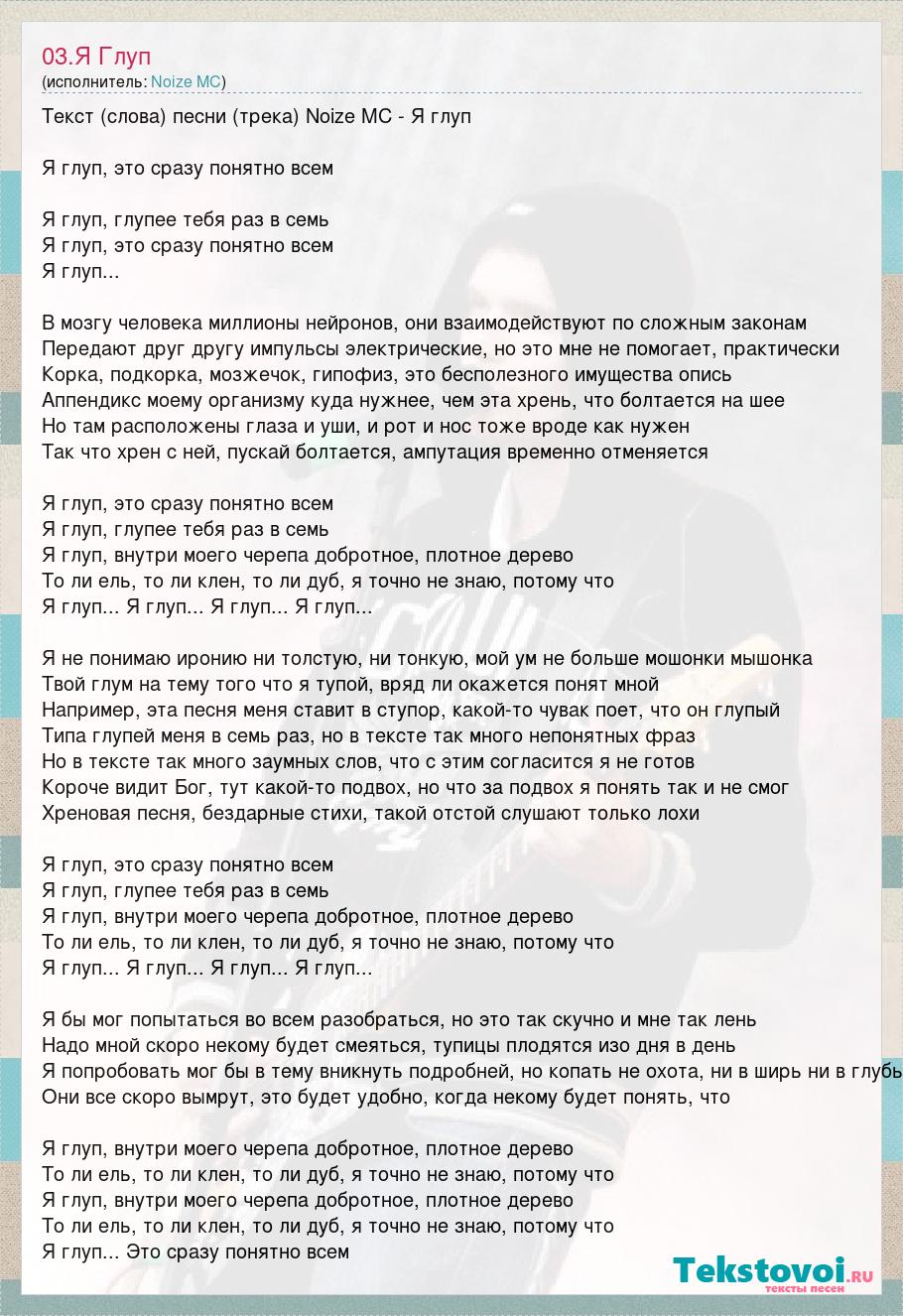 Текст (слова) песни (трека) Noize MC - Я глуп Я глуп, это сразу понятно всем Я глуп, глупее тебя раз в семь Я глуп, это сразу понятно всем Я глуп... В мозгу человека миллионы нейронов, они взаимодействуют по сложным законам Передают друг другу импульсы электрические, но это мне не помогает, практически Корка, подкорка, мозжечок, гипофиз, это бесполезного имущества опись Аппендикс моему организму куда нужнее, чем эта хрень, что болтается на шее Но там расположены глаза и уши, и рот и нос тоже вроде как нужен Так что хрен с ней, пускай болтается, ампутация временно отменяется Я глуп, это сразу понятно всем Я глуп, глупее тебя раз в семь Я глуп, внутри моего черепа добротное, плотное дерево То ли ель, то ли клен, то ли дуб, я точно не знаю, потому что Я глуп... Я глуп... Я глуп... Я глуп... Я не понимаю иронию ни толстую, ни тонкую, мой ум не больше мошонки мышонка Твой глум на тему того что я тупой, вряд ли окажется понят мной Например, эта песня меня ставит в ступор, какой-то чувак поет, что он глупый Типа глупей меня в семь раз, но в тексте так много непонятных фраз Но в тексте так много заумных слов, что с этим согласится я не готов Короче видит Бог, тут какой-то подвох, но что за подвох я понять так и не смог Хреновая песня, бездарные стихи, такой отстой слушают только лохи Я глуп, это сразу понятно всем Я глуп, глупее тебя раз в семь Я глуп, внутри моего черепа добротное, плотное дерево То ли ель, то ли клен, то ли дуб, я точно не знаю, потому что Я глуп... Я глуп... Я глуп... Я глуп... Я бы мог попытаться во всем разобраться, но это так скучно и мне так лень Надо мной скоро некому будет смеяться, тупицы плодятся изо дня в день Я попробовать мог бы в тему вникнуть подробней, но копать не охота, ни в ширь ни в глубь Они все скоро вымрут, это будет удобно, когда некому будет понять, что Я глуп, внутри моего черепа добротное, плотное дерево То ли ель, то ли клен, то ли дуб, я точно не знаю, потому что Я глуп, внутри моего черепа добротное, плотное дерево То ли ель, то ли клен, то ли дуб, я точно не знаю, потому что Я глуп... Это сразу понятно всем