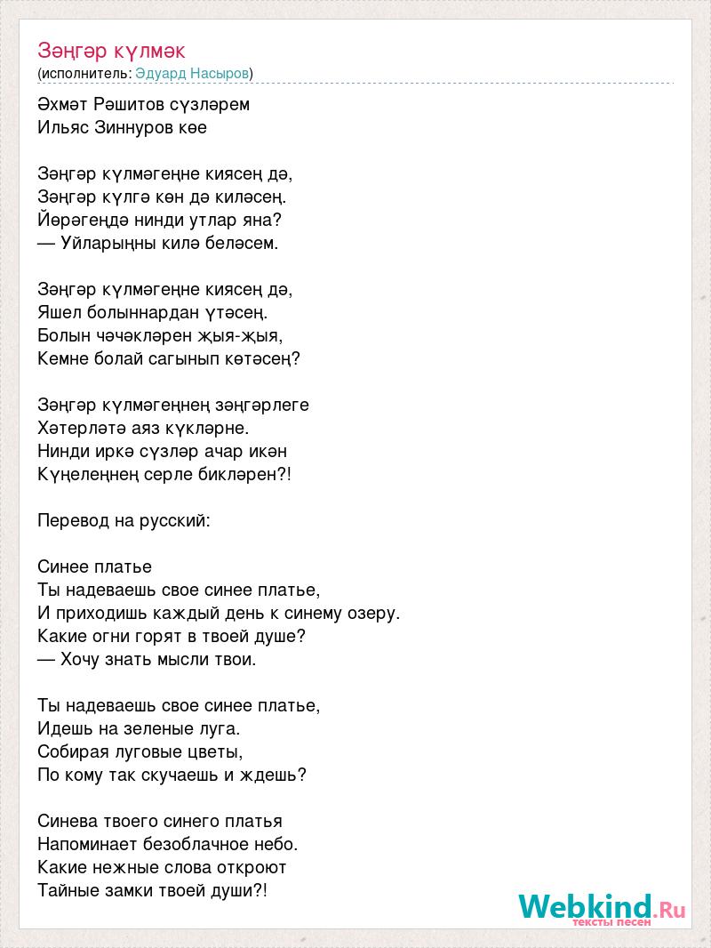 Әхмәт Рәшитов сүзләрем Ильяс Зиннуров көе Зәңгәр күлмәгеңне киясең дә, Зәңгәр күлгә көн дә киләсең. Йөрәгеңдә нинди утлар яна? — Уйларыңны килә беләсем. Зәңгәр күлмәгеңне киясең дә, Яшел болыннардан үтәсең. Болын чәчәкләрен җыя-җыя, Кемне болай сагынып көтәсең? Зәңгәр күлмәгеңнең зәңгәрлеге Хәтерләтә аяз күкләрне. Нинди иркә сүзләр ачар икән Күңелеңнең серле бикләрен?! Перевод на русский: Синее платье Ты надеваешь свое синее платье, И приходишь каждый день к синему озеру. Какие огни горят в твоей душе? — Хочу знать мысли твои. Ты надеваешь свое синее платье, Идешь на зеленые луга. Собирая луговые цветы, По кому так скучаешь и ждешь? Синева твоего синего платья Напоминает безоблачное небо. Какие нежные слова откроют Тайные замки твоей души?!