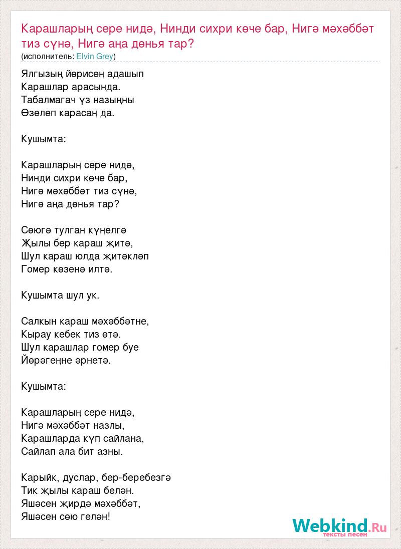 Главная→Исполнители→Elvin Grey→Карашларың сере нидә, Нинди сихри көче бар, Нигә мәхәббәт тиз сүнә, Ни