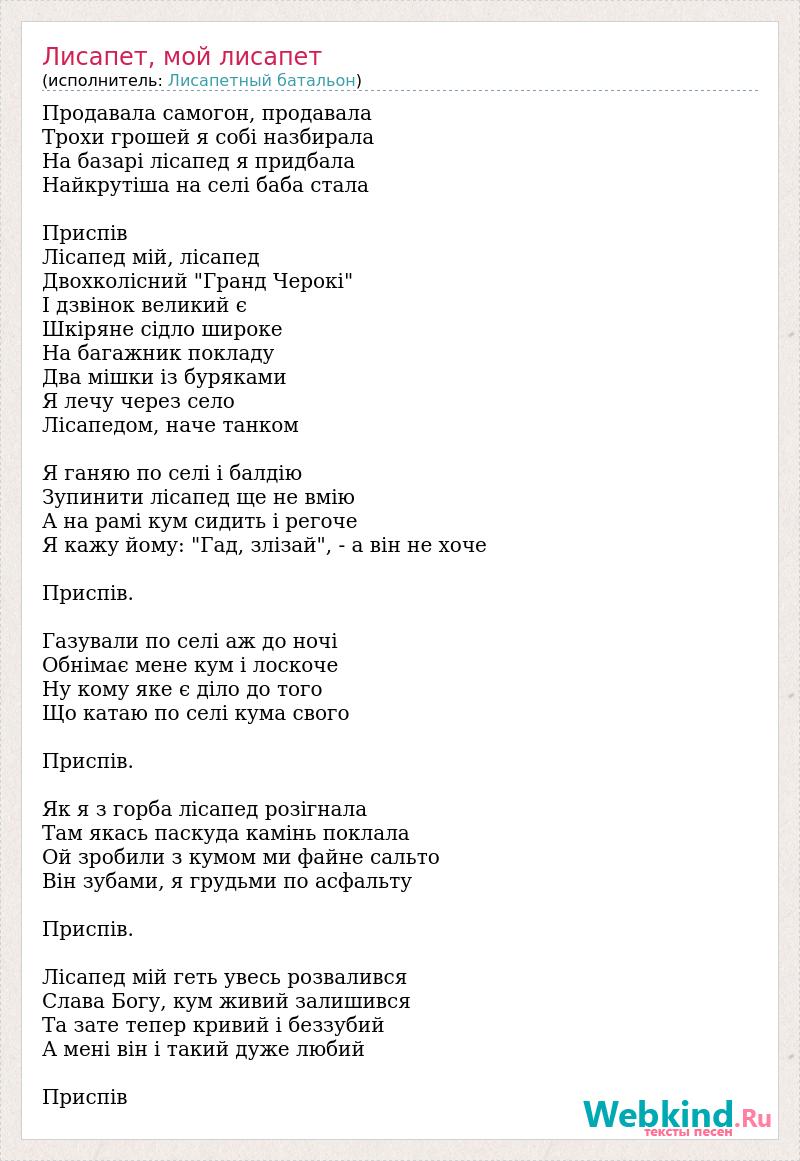 Продавала самогон, продавала Трохи грошей я собі назбирала На базарі лісапед я придбала Найкрутіша на селі баба стала Приспів Лісапед мій, лісапед Двохколісний "Гранд Черокі" І дзвінок великий є Шкіряне сідло широке На багажник покладу Два мішки із буряками Я лечу через село Лісапедом, наче танком Я ганяю по селі і балдію Зупинити лісапед ще не вмію А на рамі кум сидить і регоче Я кажу йому: "Гад, злізай", - а він не хоче Приспів. Газували по селі аж до ночі Обнімає мене кум і лоскоче Ну кому яке є діло до того Що катаю по селі кума свого Приспів. Як я з горба лісапед розігнала Там якась паскуда камінь поклала Ой зробили з кумом ми файне сальто Він зубами, я грудьми по асфальту Приспів. Лісапед мій геть увесь розвалився Слава Богу, кум живий залишився Та зате тепер кривий і беззубий А мені він і такий дуже любий Приспів