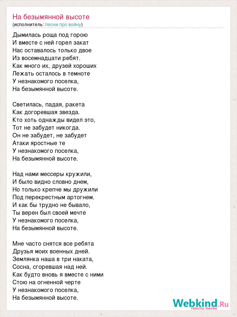 Дымилась роща под горою И вместе с ней горел закат Нас оставалось только двое Из восемнадцати ребят. Как много их, друзей хороших Лежать осталось в темноте У незнакомого поселка, На безымянной высоте. Светилась, падая, ракета Как догоревшая звезда. Кто хоть однажды видел это, Тот не забудет никогда. Он не забудет, не забудет Атаки яростные те У незнакомого поселка, На безымянной высоте. Над нами мессеры кружили, И было видно словно днем, Но только крепче мы дружили Под перекрестным артогнем. И как бы трудно не бывало, Ты верен был своей мечте У незнакомого поселка, На безымянной высоте. Мне часто снятся все ребята Друзья моих военных дней. Землянка наша в три наката, Сосна, сгоревшая над ней. Как будто вновь я вместе с ними Стою на огненной черте У незнакомого поселка, На безымянной высоте.