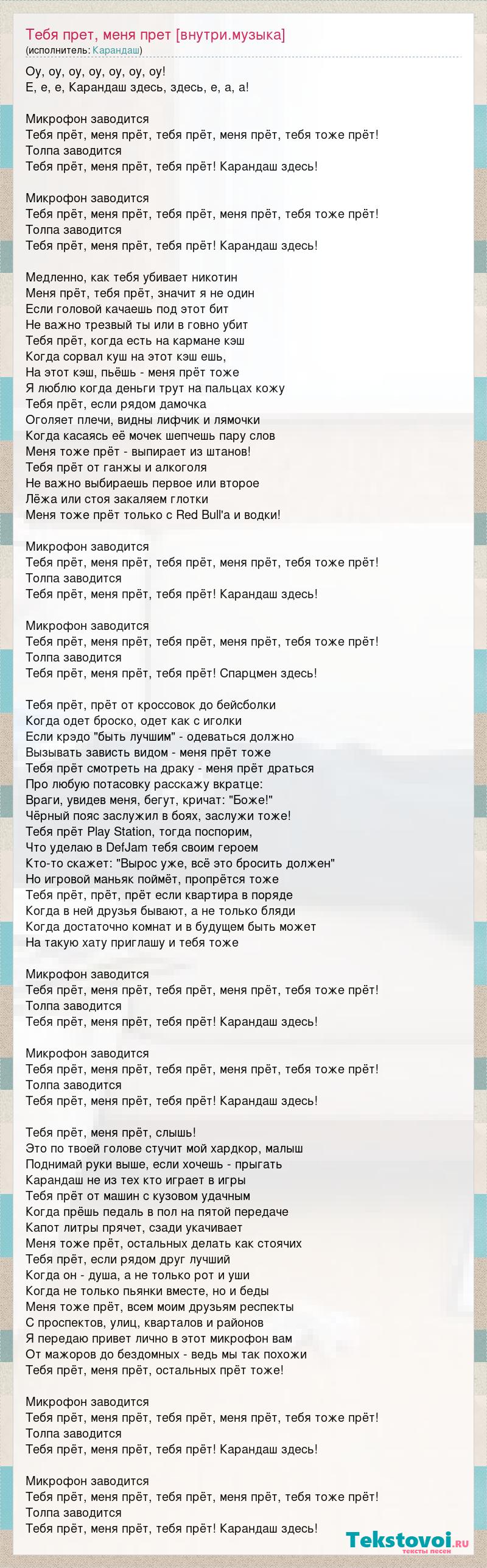 Оу, оу, оу, оу, оу, оу, оу! Е, е, е, Карандаш здесь, здесь, е, а, а! Микрофон заводится Тебя прёт, меня прёт, тебя прёт, меня прёт, тебя тоже прёт! Толпа заводится Тебя прёт, меня прёт, тебя прёт! Карандаш здесь! Микрофон заводится Тебя прёт, меня прёт, тебя прёт, меня прёт, тебя тоже прёт! Толпа заводится Тебя прёт, меня прёт, тебя прёт! Карандаш здесь! Медленно, как тебя убивает никотин Меня прёт, тебя прёт, значит я не один Если головой качаешь под этот бит Не важно трезвый ты или в говно убит Тебя прёт, когда есть на кармане кэш Когда сорвал куш на этот кэш ешь, На этот кэш, пьёшь - меня прёт тоже Я люблю когда деньги трут на пальцах кожу Тебя прёт, если рядом дамочка Оголяет плечи, видны лифчик и лямочки Когда касаясь её мочек шепчешь пару слов Меня тоже прёт - выпирает из штанов! Тебя прёт от ганжы и алкоголя Не важно выбираешь первое или второе Лёжа или стоя закаляем глотки Меня тоже прёт только с Red Bull'а и водки! Микрофон заводится Тебя прёт, меня прёт, тебя прёт, меня прёт, тебя тоже прёт! Толпа заводится Тебя прёт, меня прёт, тебя прёт! Карандаш здесь! Микрофон заводится Тебя прёт, меня прёт, тебя прёт, меня прёт, тебя тоже прёт! Толпа заводится Тебя прёт, меня прёт, тебя прёт! Спарцмен здесь! Тебя прёт, прёт от кроссовок до бейсболки Когда одет броско, одет как с иголки Если крэдо "быть лучшим" - одеваться должно Вызывать зависть видом - меня прёт тоже Тебя прёт смотреть на драку - меня прёт драться Про любую потасовку расскажу вкратце: Враги, увидев меня, бегут, кричат: "Боже!" Чёрный пояс заслужил в боях, заслужи тоже! Тебя прёт Play Station, тогда поспорим, Что уделаю в DefJam тебя своим героем Кто-то скажет: "Вырос уже, всё это бросить должен" Но игровой маньяк поймёт, пропрётся тоже Тебя прёт, прёт, прёт если квартира в поряде Когда в ней друзья бывают, а не только бляди Когда достаточно комнат и в будущем быть может На такую хату приглашу и тебя тоже Микрофон заводится Тебя прёт, меня прёт, тебя прёт, меня прёт, тебя тоже прёт! Толпа заводится Тебя прёт, меня прёт, тебя прёт! Карандаш здесь! Микрофон заводится Тебя прёт, меня прёт, тебя прёт, меня прёт, тебя тоже прёт! Толпа заводится Тебя прёт, меня прёт, тебя прёт! Карандаш здесь! Тебя прёт, меня прёт, слышь! Это по твоей голове стучит мой хардкор, малыш Поднимай руки выше, если хочешь - прыгать Карандаш не из тех кто играет в игры Тебя прёт от машин с кузовом удачным Когда прёшь педаль в пол на пятой передаче Капот литры прячет, сзади укачивает Меня тоже прёт, остальных делать как стоячих Тебя прёт, если рядом друг лучший Когда он - душа, а не только рот и уши Когда не только пьянки вместе, но и беды Меня тоже прёт, всем моим друзьям респекты С проспектов, улиц, кварталов и районов Я передаю привет лично в этот микрофон вам От мажоров до бездомных - ведь мы так похожи Тебя прёт, меня прёт, остальных прёт тоже! Микрофон заводится Тебя прёт, меня прёт, тебя прёт, меня прёт, тебя тоже прёт! Толпа заводится Тебя прёт, меня прёт, тебя прёт! Карандаш здесь! Микрофон заводится Тебя прёт, меня прёт, тебя прёт, меня прёт, тебя тоже прёт! Толпа заводится Тебя прёт, меня прёт, тебя прёт! Карандаш здесь!