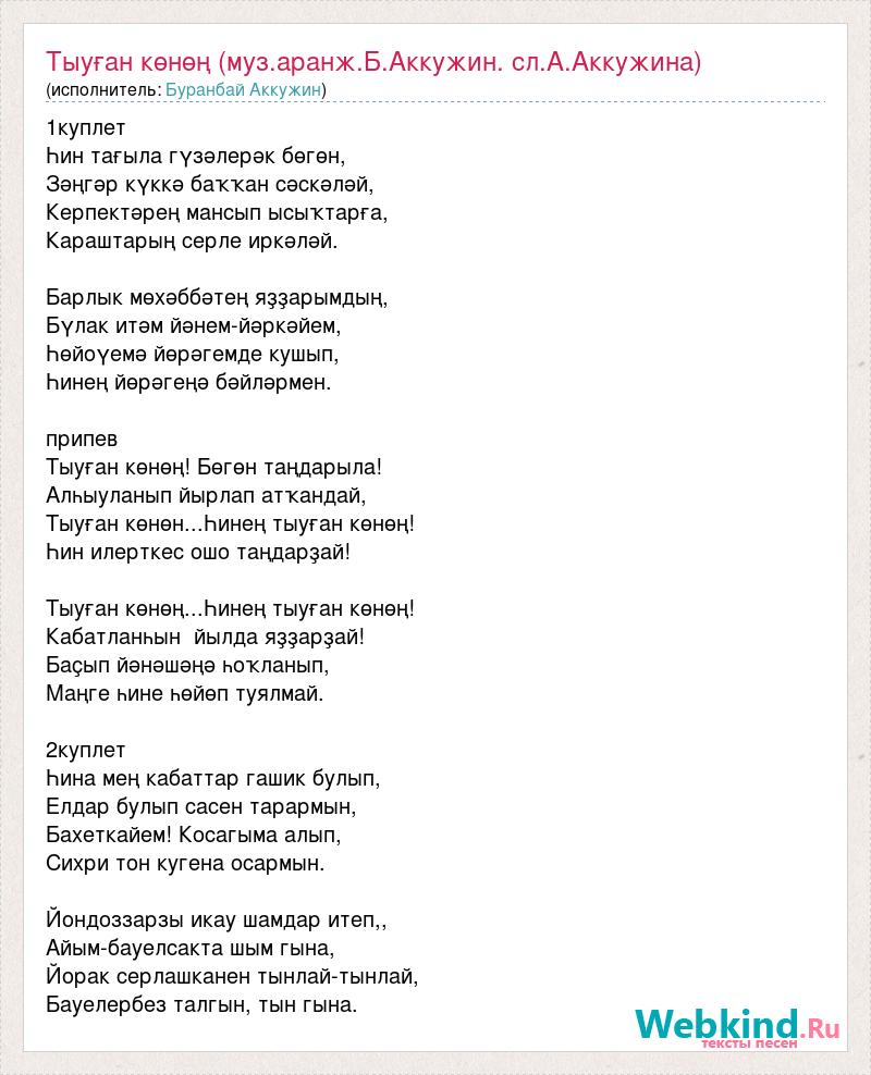 1куплет Һин тағыла гүзәлерәк бөгөн, Зәңгәр күккә баҡҡан сәскәләй, Керпектәрең мансып ысыҡтарға, Караштарың серле иркәләй. Барлык мөхәббәтең яҙҙарымдың, Бүлак итәм йәнем-йәркәйем, Һөйоүемә йөрәгемде кушып, Һинең йөрәгеңә бәйләрмен. припев Тыуған көнөң! Бөгөн таңдарыла! Алһыуланып йырлап атҡандай, Тыуған көнөн...Һинең тыуған көнөң! Һин илерткес ошо таңдарҙай! Тыуған көнөң...Һинең тыуған көнөң! Кабатланһын йылда яҙҙарҙай! Баҫып йәнәшәңә һоҡланып, Маңге һине һөйөп туялмай. 2куплет Һина мең кабаттар гашик булып, Елдар булып сасен тарармын, Бахеткайем! Косагыма алып, Сихри тон кугена осармын. Йондоззарзы икау шамдар итеп,, Айым-бауелсакта шым гына, Йорак серлашканен тынлай-тынлай, Бауелербез талгын, тын гына.