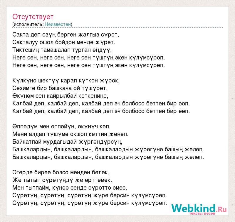 Сакта деп өзүң берген жалгыз сүрөт, Сакталуу ошол бойдон менде жүрөт. Тиктешиң тамашалап турган өңдүү, Неге сен, неге сен, неге сен түштүң экен күлүмсүрөп. Неге сен, неге сен, неге сен түштүң экен күлүмсүрөп. Күлкүңө шектүү карап күткөн жүрөк, Сезимге бир башкача ой түшүрөт. Өкүнөм сен кайрылбай кеткениңе, Калбай деп, калбай деп, калбай деп эч болбосо беттен бир өөп. Калбай деп, калбай деп, калбай деп эч болбосо беттен бир өөп. Өппөдүм мен өппөйүн, өкүнүч көп, Мени алдап түшүмө окшоп кеттиң жөнөп. Байкатпай мурдагыдай жүргөндүрсүң, Башкалардын, башкалардын, башкалардын жүрөгүнө башың жөлөп. Башкалардын, башкалардын, башкалардын жүрөгүнө башың жөлөп. Эгерде бирөө болсо менден бөлөк, Же тытып сүрөтүңдү же өрттөмөк. Мен тытпайм, күнөө сенде сүрөттө эмес, Сүрөтүң, сүрөтүң, сүрөтүң жүрө берсин күлүмсүрөп. Сүрөтүң, сүрөтүң, сүрөтүң жүрө берсин күлүмсүрөп.