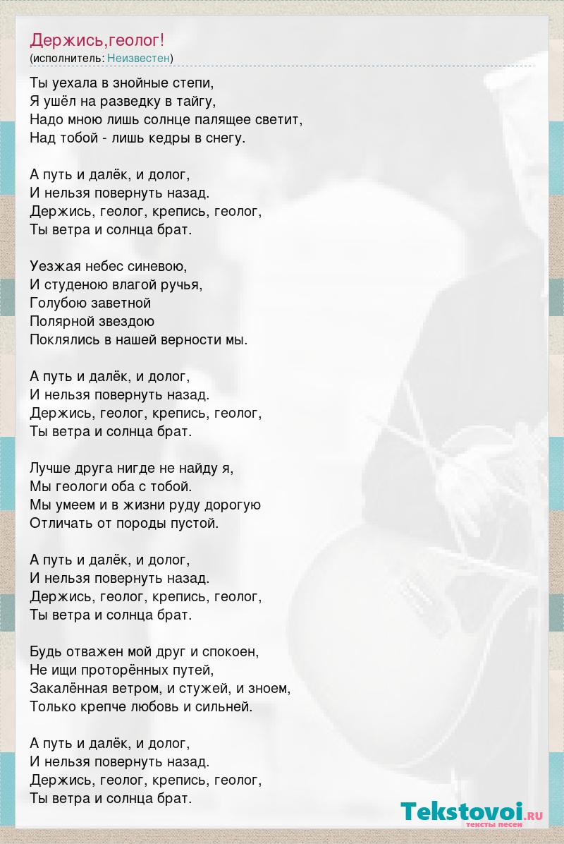 Ты уехала в знойные степи, Я ушёл на разведку в тайгу, Надо мною лишь солнце палящее светит, Над тобой - лишь кедры в снегу. А путь и далёк, и долог, И нельзя повернуть назад. Держись, геолог, крепись, геолог, Ты ветра и солнца брат. Уезжая небес синевою, И студеною влагой ручья, Голубою заветной Полярной звездою Поклялись в нашей верности мы. А путь и далёк, и долог, И нельзя повернуть назад. Держись, геолог, крепись, геолог, Ты ветра и солнца брат. Лучше друга нигде не найду я, Мы геологи оба с тобой. Мы умеем и в жизни руду дорогую Отличать от породы пустой. А путь и далёк, и долог, И нельзя повернуть назад. Держись, геолог, крепись, геолог, Ты ветра и солнца брат. Будь отважен мой друг и спокоен, Не ищи проторённых путей, Закалённая ветром, и стужей, и зноем, Только крепче любовь и сильней. А путь и далёк, и долог, И нельзя повернуть назад. Держись, геолог, крепись, геолог, Ты ветра и солнца брат.