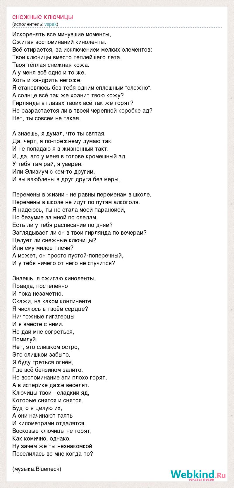 Искоренять все минувшие моменты, Сжигая воспоминаний киноленты. Всё стирается, за исключением мелких элементов: Твои ключицы вместо теплейшего лета. Твоя тёплая снежная кожа. А у меня всё одно и то же, Хоть и хандрить негоже, Я становлюсь без тебя одним сплошным "сложно". А солнце всё так же хранит твою кожу? Гирлянды в глазах твоих всё так же горят? Не разрастается ли в твоей черепной коробке ад? Нет, ты совсем не такая. А знаешь, я думал, что ты святая. Да, чёрт, я по-прежнему думаю так. И не попадаю я в жизненный такт. И, да, это у меня в голове кромешный ад, У тебя там рай, я уверен. Или Элизиум с кем-то другим, И вы влюблены в друг друга без меры. Перемены в жизни - не равны переменам в школе. Перемены в школе не идут по путям алкоголя. Я надеюсь, ты не стала моей паранойей, Но безумие за мной по следам. Есть ли у тебя расписание по дням? Заглядывает ли он в твои гирлянда по вечерам? Целует ли снежные ключицы? Или ему милее плечи? А может, он просто пустой-поперечный, И у тебя ничего от него не стучится? Знаешь, я сжигаю киноленты. Правда, постепенно И пока незаметно. Скажи, на каком континенте Я числюсь в твоём сердце? Ничтожные гигагерцы И я вместе с ними. Но дай мне согреться, Помилуй. Нет, это слишком остро, Это слишком забыто. Я буду греться огнём, Где всё бензином залито. Но воспоминание эти плохо горят, А в истерике даже веселят. Ключицы твои - сладкий яд, Которые снятся и снятся. Будто я целую их, А они начинают таять И километрами отдалятся. Восковые ключицы не горят, Как комично, однако. Ну зачем же ты незнакомкой Поселилась во мне когда-то? (музыка.Blueneck)