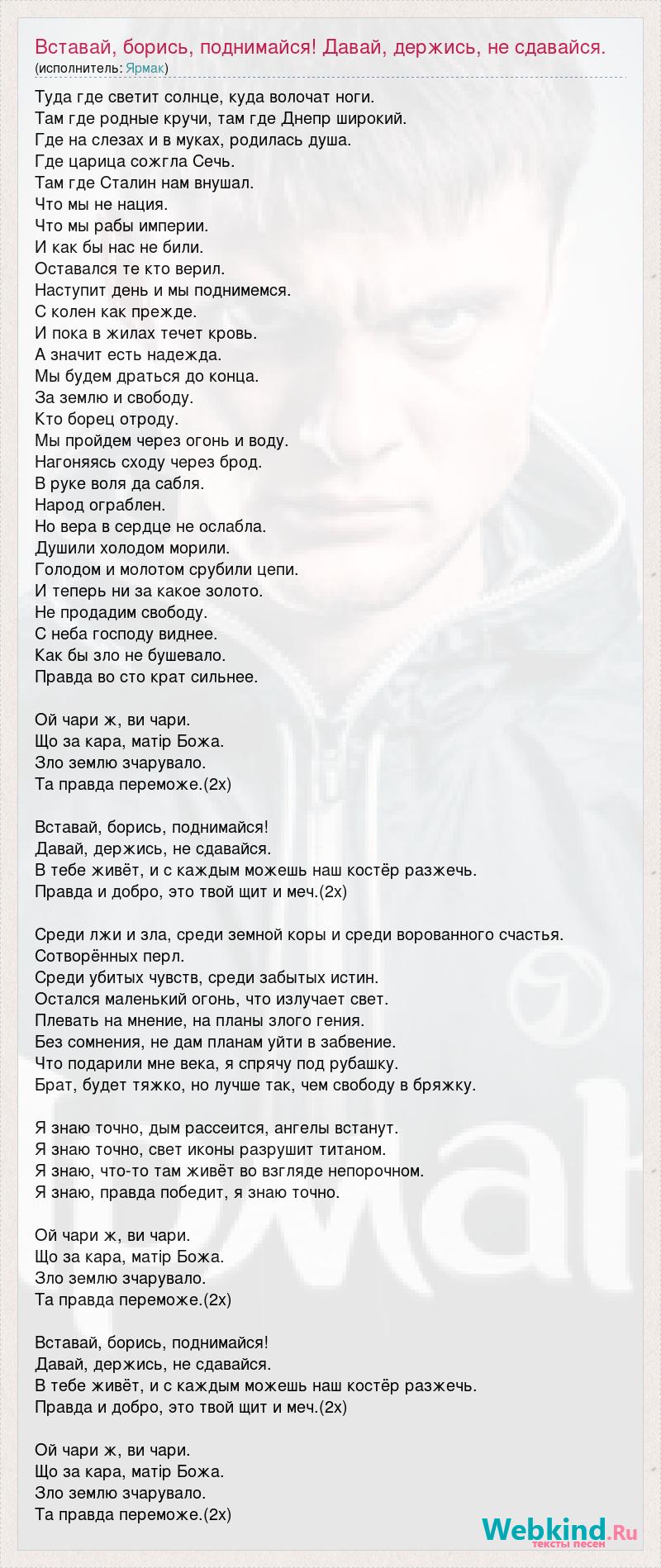 Главная→Исполнители→Ярмак→Вставай, борись, поднимайся! Давай, держись, не сдавайся. В тебе живёт, и с каж