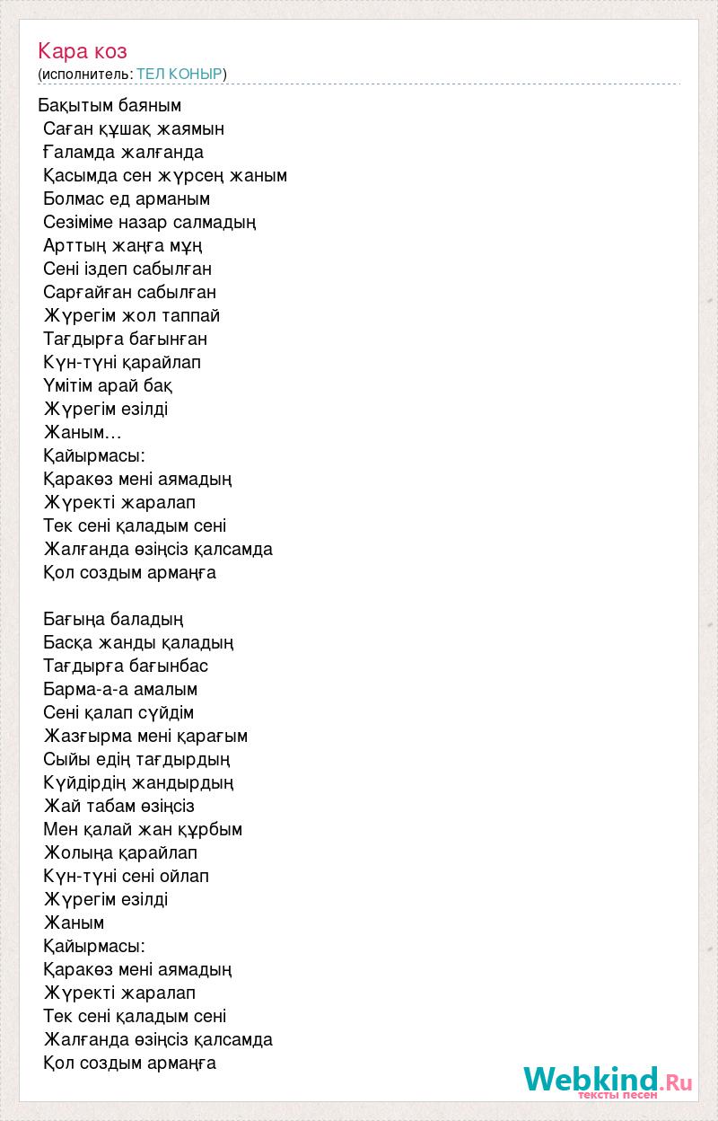 Бақытым баяным Саған құшақ жаямын Ғаламда жалғанда Қасымда сен жүрсең жаным Болмас ед арманым Сезіміме назар салмадың Арттың жаңға мұң Сені іздеп сабылған Сарғайған сабылған Жүрегім жол таппай Тағдырға бағынған Күн-түні қарайлап Үмітім арай бақ Жүрегім езілді Жаным… Қайырмасы: Қаракөз мені аямадың Жүректі жаралап Тек сені қаладым сені Жалғанда өзіңсіз қалсамда Қол создым армаңға Бағыңа баладың Басқа жанды қаладың Тағдырға бағынбас Барма-а-а амалым Сені қалап сүйдім Жазғырма мені қарағым Сыйы едің тағдырдың Күйдірдің жандырдың Жай табам өзіңсіз Мен қалай жан құрбым Жолыңа қарайлап Күн-түні сені ойлап Жүрегім езілді Жаным Қайырмасы: Қаракөз мені аямадың Жүректі жаралап Тек сені қаладым сені Жалғанда өзіңсіз қалсамда Қол создым армаңға