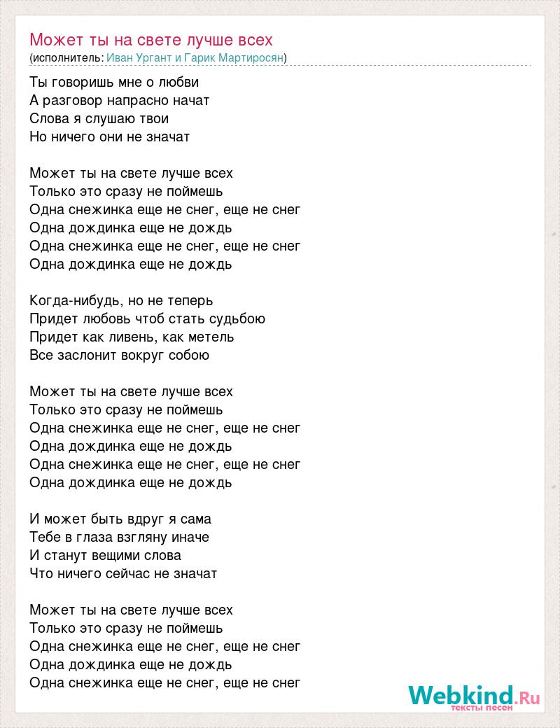 Ты говоришь мне о любви А разговор напрасно начат Слова я слушаю твои Но ничего они не значат Может ты на свете лучше всех Только это сразу не поймешь Одна снежинка еще не снег, еще не снег Одна дождинка еще не дождь Одна снежинка еще не снег, еще не снег Одна дождинка еще не дождь Когда-нибудь, но не теперь Придет любовь чтоб стать судьбою Придет как ливень, как метель Все заслонит вокруг собою Может ты на свете лучше всех Только это сразу не поймешь Одна снежинка еще не снег, еще не снег Одна дождинка еще не дождь Одна снежинка еще не снег, еще не снег Одна дождинка еще не дождь И может быть вдруг я сама Тебе в глаза взгляну иначе И станут вещими слова Что ничего сейчас не значат Может ты на свете лучше всех Только это сразу не поймешь Одна снежинка еще не снег, еще не снег Одна дождинка еще не дождь Одна снежинка еще не снег, еще не снег