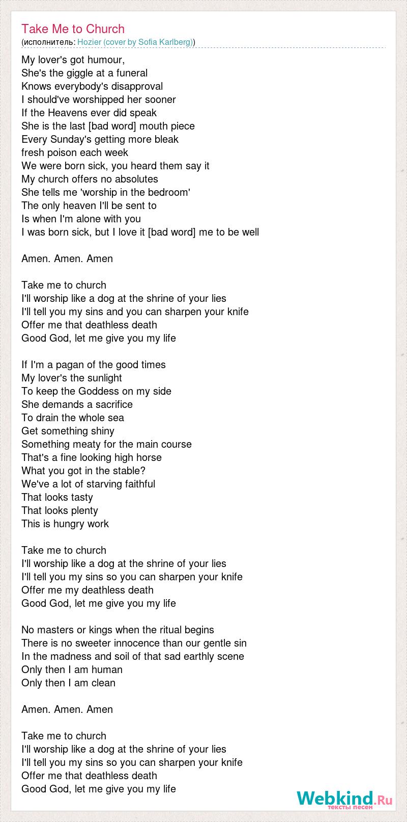 My lover's got humour, She's the giggle at a funeral Knows everybody's disapproval I should've worshipped her sooner If the Heavens ever did speak She is the last [bad word] mouth piece Every Sunday's getting more bleak fresh poison each week We were born sick, you heard them say it My church offers no absolutes She tells me 'worship in the bedroom' The only heaven I'll be sent to Is when I'm alone with you I was born sick, but I love it [bad word] me to be well Amen. Amen. Amen Take me to church I'll worship like a dog at the shrine of your lies I'll tell you my sins and you can sharpen your knife Offer me that deathless death Good God, let me give you my life If I'm a pagan of the good times My lover's the sunlight To keep the Goddess on my side She demands a sacrifice To drain the whole sea Get something shiny Something meaty for the main course That's a fine looking high horse What you got in the stable? We've a lot of starving faithful That looks tasty That looks plenty This is hungry work Take me to church I'll worship like a dog at the shrine of your lies I'll tell you my sins so you can sharpen your knife Offer me my deathless death Good God, let me give you my life No masters or kings when the ritual begins There is no sweeter innocence than our gentle sin In the madness and soil of that sad earthly scene Only then I am human Only then I am clean Amen. Amen. Amen Take me to church I'll worship like a dog at the shrine of your lies I'll tell you my sins so you can sharpen your knife Offer me that deathless death Good God, let me give you my life