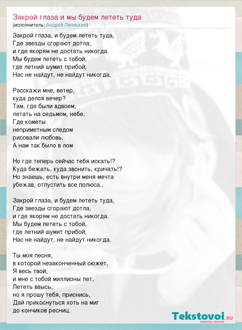 Закрой глаза, и будем лететь туда, Где звезды сгорают дотла, и где якорям не достать никогда. Мы будем лететь с тобой, где летний шумит прибой, Нас не найдут, не найдут никогда. Расскажи мне, ветер, куда делся вечер? Там, где были вдвоем, летать на седьмом, небе. Где кометы неприметным следом рисовали любовь, А нам так было в лом Но где теперь сейчас тебя искать!? Куда бежать, куда звонить, кричать!? Но знаешь, есть внутри меня мечта убежав, отпустить все полюса.. Закрой глаза, и будем лететь туда, Где звезды сгорают дотла, и где якорям не достать никогда. Мы будем лететь с тобой, где летний шумит прибой, Нас не найдут, не найдут никогда. Ты моя песня, в которой незаконченный сюжет, Я весь твой, и мне с тобой миллионы лет. Лететь ввысь, но я прошу тебя, приснись, Дай прикоснуться хоть на миг до кончиков ресниц.