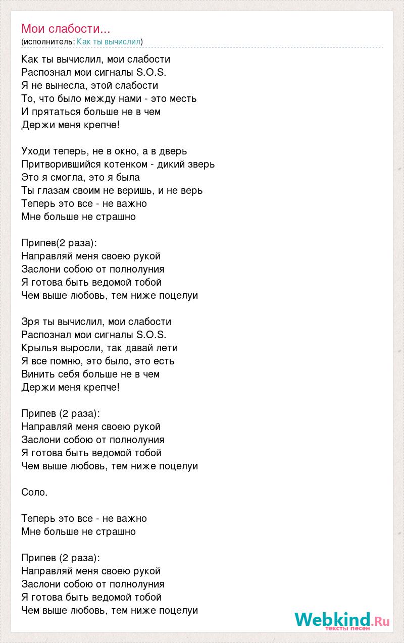 Как ты вычислил, мои слабости Распознал мои сигналы S.O.S. Я не вынесла, этой слабости То, что было между нами - это месть И прятаться больше не в чем Держи меня крепче! Уходи теперь, не в окно, а в дверь Притворившийся котенком - дикий зверь Это я смогла, это я была Ты глазам своим не веришь, и не верь Теперь это все - не важно Мне больше не страшно Припев(2 раза): Направляй меня своею рукой Заслони собою от полнолуния Я готова быть ведомой тобой Чем выше любовь, тем ниже поцелуи Зря ты вычислил, мои слабости Распознал мои сигналы S.O.S. Крылья выросли, так давай лети Я все помню, это было, это есть Винить себя больше не в чем Держи меня крепче! Припев (2 раза): Направляй меня своею рукой Заслони собою от полнолуния Я готова быть ведомой тобой Чем выше любовь, тем ниже поцелуи Соло. Теперь это все - не важно Мне больше не страшно Припев (2 раза): Направляй меня своею рукой Заслони собою от полнолуния Я готова быть ведомой тобой Чем выше любовь, тем ниже поцелуи