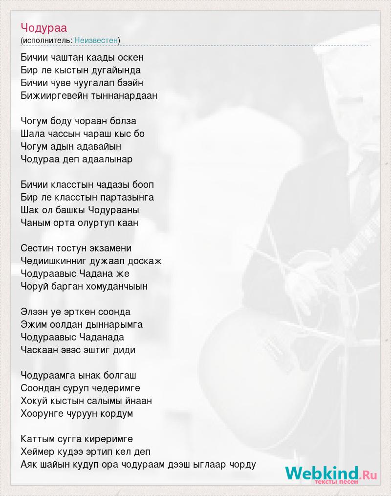 Бичии чаштан каады оскен Бир ле кыстын дугайында Бичии чуве чуугалап бээйн Бижииргевейн тыннанардаан Чогум боду чораан болза Шала чассын чараш кыс бо Чогум адын адавайын Чодураа деп адаалынар Бичии класстын чадазы бооп Бир ле класстын партазынга Шак ол башкы Чодурааны Чаным орта олуртуп каан Сестин тостун экзамени Чедиишкинниг дужаап доскаж Чодураавыс Чадана же Чоруй барган хомуданчыын Элээн уе эрткен соонда Эжим оолдан дыннарымга Чодураавыс Чаданада Часкаан эвэс эштиг диди Чодураамга ынак болгаш Соондан суруп чедеримге Хокуй кыстын салымы йнаан Хоорунге чуруун кордум Каттым сугга киреримге Хеймер кудээ эртип кел деп Аяк шайын кудуп ора чодураам дээш ыглаар чорду