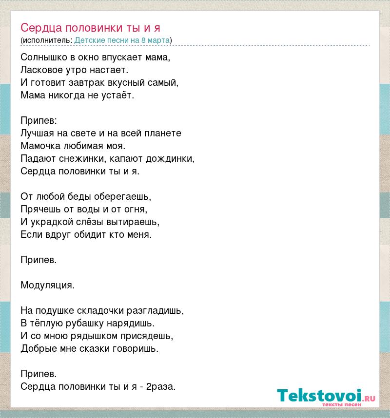 Солнышко в окно впускает мама, Ласковое утро настает. И готовит завтрак вкусный самый, Мама никогда не устаёт. Припев: Лучшая на свете и на всей планете Мамочка любимая моя. Падают снежинки, капают дождинки, Сердца половинки ты и я. От любой беды оберегаешь, Прячешь от воды и от огня, И украдкой слёзы вытираешь, Если вдруг обидит кто меня. Припев. Модуляция. На подушке складочки разгладишь, В тёплую рубашку нарядишь. И со мною рядышком присядешь, Добрые мне сказки говоришь. Припев. Сердца половинки ты и я - 2раза.