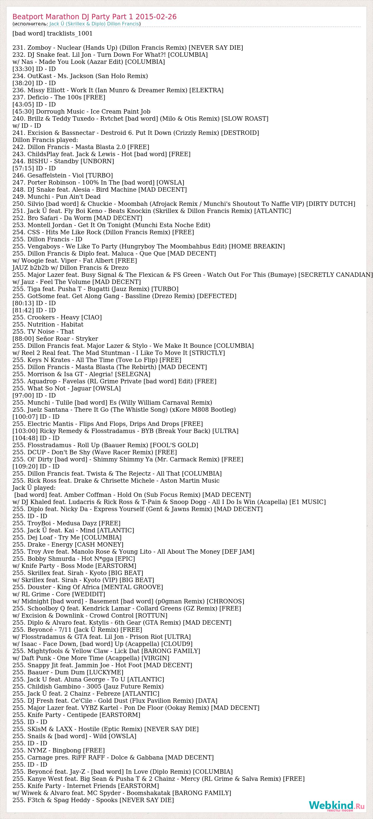 [bad word] tracklists_1001 231. Zomboy - Nuclear (Hands Up) (Dillon Francis Remix) [NEVER SAY DIE] 232. DJ Snake feat. Lil Jon - Turn Down For What?! [COLUMBIA] w/ Nas - Made You Look (Aazar Edit) [COLUMBIA] [33:30] ID - ID 234. OutKast - Ms. Jackson (San Holo Remix) [38:20] ID - ID 236. Missy Elliott - Work It (Ian Munro & Dreamer Remix) [ELEKTRA] 237. Deficio - The 100s [FREE] [43:05] ID - ID [45:30] Dorrough Music - Ice Cream Paint Job 240. Brillz & Teddy Tuxedo - Rvtchet [bad word] (Milo & Otis Remix) [SLOW ROAST] w/ ID - ID 241. Excision & Bassnectar - Destroid 6. Put It Down (Crizzly Remix) [DESTROID] Dillon Francis played: 242. Dillon Francis - Masta Blasta 2.0 [FREE] 243. ChildsPlay feat. Jack & Lewis - Hot [bad word] [FREE] 244. BISHU - Standby [UNBORN] [57:15] ID - ID 246. Gesaffelstein - Viol [TURBO] 247. Porter Robinson - 100% In The [bad word] [OWSLA] 248. DJ Snake feat. Alesia - Bird Machine [MAD DECENT] 249. Munchi - Pun Ain't Dead 250. Silvio [bad word] & Chuckie - Moombah (Afrojack Remix / Munchi's Shoutout To Naffie VIP) [DIRTY DUTCH] 251. Jack Ü feat. Fly Boi Keno - Beats Knockin (Skrillex & Dillon Francis Remix) [ATLANTIC] 252. Bro Safari - Da Worm [MAD DECENT] 253. Montell Jordan - Get It On Tonight (Munchi Esta Noche Edit) 254. CSS - Hits Me Like Rock (Dillon Francis Remix) [FREE] 255. Dillon Francis - ID 255. Vengaboys - We Like To Party (Hungryboy The Moombahbus Edit) [HOME BREAKIN] 255. Dillon Francis & Diplo feat. Maluca - Que Que [MAD DECENT] w/ Woogie feat. Viper - Fat Albert [FREE] JAUZ b2b2b w/ Dillon Francis & Drezo 255. Major Lazer feat. Busy Signal & The Flexican & FS Green - Watch Out For This (Bumaye) [SECRETLY CANADIAN] w/ Jauz - Feel The Volume [MAD DECENT] 255. Tiga feat. Pusha T - Bugatti (Jauz Remix) [TURBO] 255. GotSome feat. Get Along Gang - Bassline (Drezo Remix) [DEFECTED] [80:13] ID - ID [81:42] ID - ID 255. Crookers - Heavy [CIAO] 255. Nutrition - Habitat 255. TV Noise - That [88:00] Señor Roar - Stryker 255. Dillon Francis feat. Major Lazer & Stylo - We Make It Bounce [COLUMBIA] w/ Reel 2 Real feat. The Mad Stuntman - I Like To Move It [STRICTLY] 255. Keys N Krates - All The Time (Tove Lo Flip) [FREE] 255. Dillon Francis - Masta Blasta (The Rebirth) [MAD DECENT] 255. Morrison & Isa GT - Alegria! [SELEGNA] 255. Aquadrop - Favelas (RL Grime Private [bad word] Edit) [FREE] 255. What So Not - Jaguar [OWSLA] [97:00] ID - ID 255. Munchi - Tulile [bad word] Es (Willy William Carnaval Remix) 255. Juelz Santana - There It Go (The Whistle Song) (xKore M808 Bootleg) [100:07] ID - ID 255. Electric Mantis - Flips And Flops, Drips And Drops [FREE] [103:00] Ricky Remedy & Flosstradamus - BYB (Break Your Back) [ULTRA] [104:48] ID - ID 255. Flosstradamus - Roll Up (Baauer Remix) [FOOL'S GOLD] 255. DCUP - Don't Be Shy (Wave Racer Remix) [FREE] 255. Ol' Dirty [bad word] - Shimmy Shimmy Ya (Mr. Carmack Remix) [FREE] [109:20] ID - ID 255. Dillon Francis feat. Twista & The Rejectz - All That [COLUMBIA] 255. Rick Ross feat. Drake & Chrisette Michele - Aston Martin Music Jack Ü played: [bad word] feat. Amber Coffman - Hold On (Sub Focus Remix) [MAD DECENT] w/ DJ Khaled feat. Ludacris & Rick Ross & T-Pain & Snoop Dogg - All I Do Is Win (Acapella) [E1 MUSIC] 255. Diplo feat. Nicky Da - Express Yourself (Gent & Jawns Remix) [MAD DECENT] 255. ID - ID 255. TroyBoi - Medusa Dayz [FREE] 255. Jack Ü feat. Kai - Mind [ATLANTIC] 255. Dej Loaf - Try Me [COLUMBIA] 255. Drake - Energy [CASH MONEY] 255. Troy Ave feat. Manolo Rose & Young Lito - All About The Money [DEF JAM] 255. Bobby Shmurda - Hot N*gga [EPIC] w/ Knife Party - Boss Mode [EARSTORM] 255. Skrillex feat. Sirah - Kyoto [BIG BEAT] w/ Skrillex feat. Sirah - Kyoto (VIP) [BIG BEAT] 255. Douster - King Of Africa [MENTAL GROOVE] w/ RL Grime - Core [WEDIDIT] w/ Midnight [bad word] - Basement [bad word] (p0gman Remix) [CHRONOS] 255. Schoolboy Q feat. Kendrick Lamar - Collard Greens (GZ Remix) [FREE] w/ Excision & Downlink - Crowd Control [ROTTUN] 255. Diplo & Alvaro feat. Kstylis - 6th Gear (GTA Remix) [MAD DECENT] 255. Beyoncé - 7/11 (Jack Ü Remix) [FREE] w/ Flosstradamus & GTA feat. Lil Jon - Prison Riot [ULTRA] w/ Isaac - Face Down, [bad word] Up (Acappella) [CLOUD9] 255. Mightyfools & Yellow Claw - Lick Dat [BARONG FAMILY] w/ Daft Punk - One More Time (Acappella) [VIRGIN] 255. Snappy Jit feat. Jammin Joe - Hot Foot [MAD DECENT] 255. Baauer - Dum Dum [LUCKYME] 255. Jack U feat. Aluna George - To U [ATLANTIC] 255. Childish Gambino - 3005 (Jauz Future Remix) 255. Jack Ü feat. 2 Chainz - Febreze [ATLANTIC] 255. DJ Fresh feat. Ce'Cile - Gold Dust (Flux Pavilion Remix) [DATA] 255. Major Lazer feat. VYBZ Kartel - Pon De Floor (Ookay Remix) [MAD DECENT] 255. Knife Party - Centipede [EARSTORM] 255. ID - ID 255. SKisM & LAXX - Hostile (Eptic Remix) [NEVER SAY DIE] 255. Snails & [bad word] - Wild [OWSLA] 255. ID - ID 255. NYMZ - Bingbong [FREE] 255. Carnage pres. RiFF RAFF - Dolce & Gabbana [MAD DECENT] 255. ID - ID 255. Beyoncé feat. Jay-Z - [bad word] In Love (Diplo Remix) [COLUMBIA] 255. Kanye West feat. Big Sean & Pusha T & 2 Chainz - Mercy (RL Grime & Salva Remix) [FREE] 255. Knife Party - Internet Friends [EARSTORM] w/ Wiwek & Alvaro feat. MC Spyder - Boomshakatak [BARONG FAMILY] 255. F3tch & Spag Heddy - Spooks [NEVER SAY DIE]