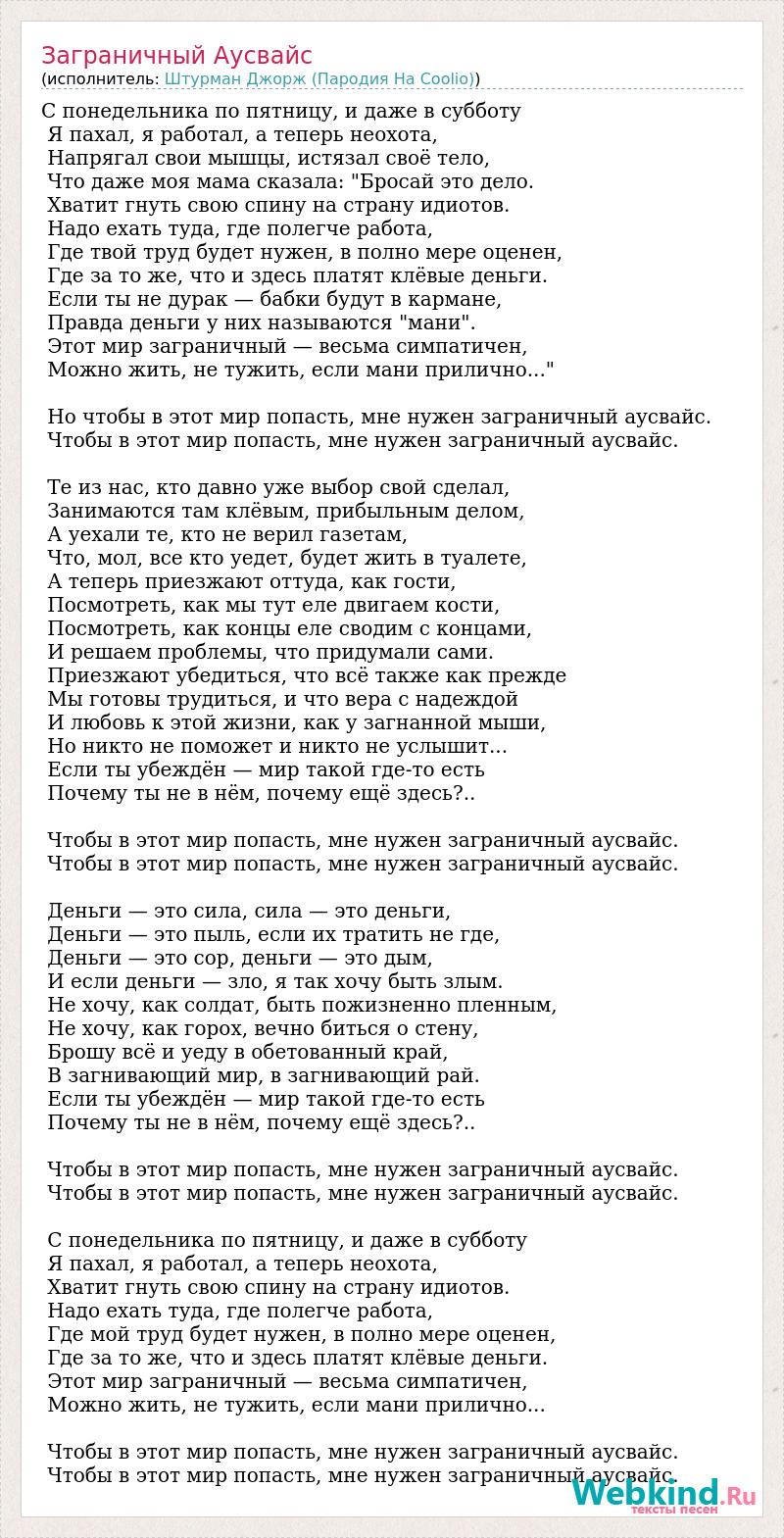 С понедельника по пятницу, и даже в субботу Я пахал, я работал, а теперь неохота, Напрягал свои мышцы, истязал своё тело, Что даже моя мама сказала: "Бросай это дело. Хватит гнуть свою спину на страну идиотов. Надо ехать туда, где полегче работа, Где твой труд будет нужен, в полно мере оценен, Где за то же, что и здесь платят клёвые деньги. Если ты не дурак — бабки будут в кармане, Правда деньги у них называются "мани". Этот мир заграничный — весьма симпатичен, Можно жить, не тужить, если мани прилично..." Но чтобы в этот мир попасть, мне нужен заграничный аусвайс. Чтобы в этот мир попасть, мне нужен заграничный аусвайс. Те из нас, кто давно уже выбор свой сделал, Занимаются там клёвым, прибыльным делом, А уехали те, кто не верил газетам, Что, мол, все кто уедет, будет жить в туалете, А теперь приезжают оттуда, как гости, Посмотреть, как мы тут еле двигаем кости, Посмотреть, как концы еле сводим с концами, И решаем проблемы, что придумали сами. Приезжают убедиться, что всё также как прежде Мы готовы трудиться, и что вера с надеждой И любовь к этой жизни, как у загнанной мыши, Но никто не поможет и никто не услышит... Если ты убеждён — мир такой где-то есть Почему ты не в нём, почему ещё здесь?.. Чтобы в этот мир попасть, мне нужен заграничный аусвайс. Чтобы в этот мир попасть, мне нужен заграничный аусвайс. Деньги — это сила, сила — это деньги, Деньги — это пыль, если их тратить не где, Деньги — это сор, деньги — это дым, И если деньги — зло, я так хочу быть злым. Не хочу, как солдат, быть пожизненно пленным, Не хочу, как горох, вечно биться о стену, Брошу всё и уеду в обетованный край, В загнивающий мир, в загнивающий рай. Если ты убеждён — мир такой где-то есть Почему ты не в нём, почему ещё здесь?.. Чтобы в этот мир попасть, мне нужен заграничный аусвайс. Чтобы в этот мир попасть, мне нужен заграничный аусвайс. С понедельника по пятницу, и даже в субботу Я пахал, я работал, а теперь неохота, Хватит гнуть свою спину на страну идиотов. Надо ехать туда, где полегче работа, Где мой труд будет нужен, в полно мере оценен, Где за то же, что и здесь платят клёвые деньги. Этот мир заграничный — весьма симпатичен, Можно жить, не тужить, если мани прилично... Чтобы в этот мир попасть, мне нужен заграничный аусвайс. Чтобы в этот мир попасть, мне нужен заграничный аусвайс.