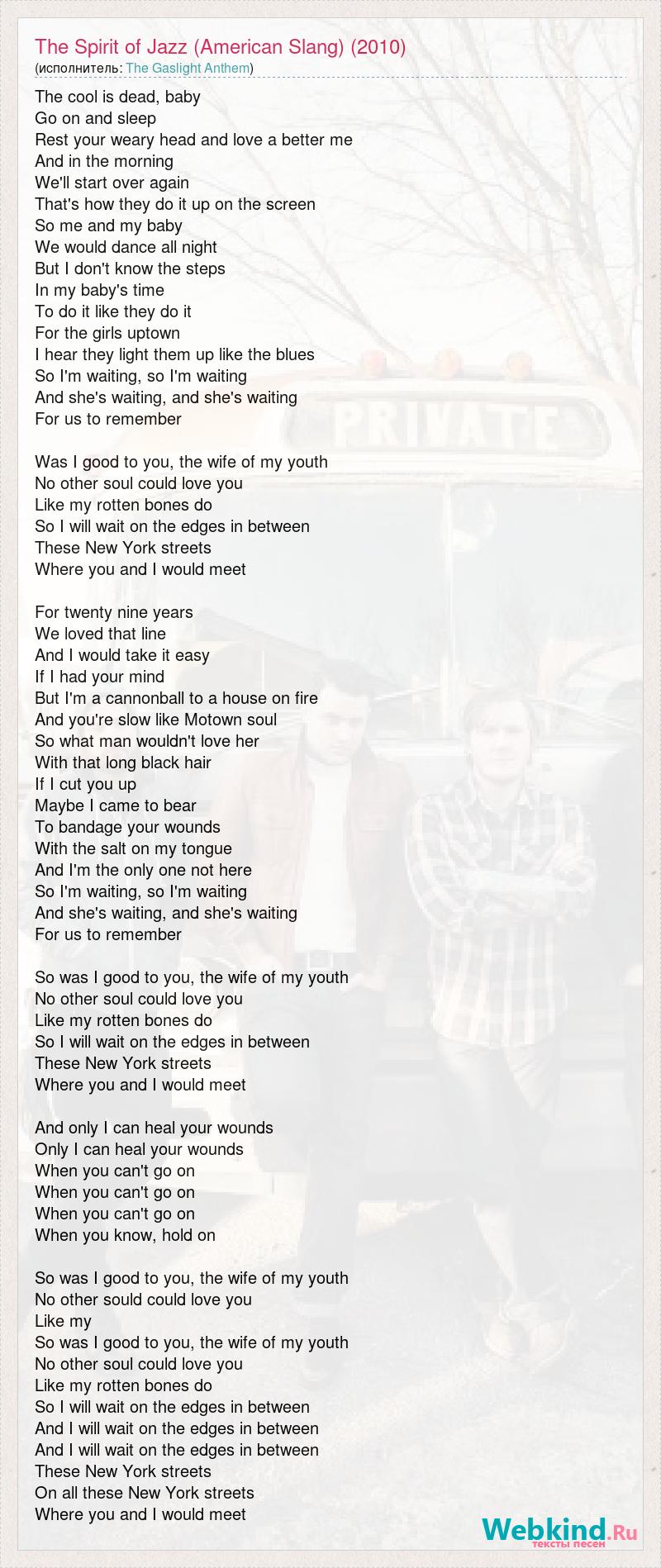 The cool is dead, baby Go on and sleep Rest your weary head and love a better me And in the morning We'll start over again That's how they do it up on the screen So me and my baby We would dance all night But I don't know the steps In my baby's time To do it like they do it For the girls uptown I hear they light them up like the blues So I'm waiting, so I'm waiting And she's waiting, and she's waiting For us to remember Was I good to you, the wife of my youth No other soul could love you Like my rotten bones do So I will wait on the edges in between These New York streets Where you and I would meet For twenty nine years We loved that line And I would take it easy If I had your mind But I'm a cannonball to a house on fire And you're slow like Motown soul So what man wouldn't love her With that long black hair If I cut you up Maybe I came to bear To bandage your wounds With the salt on my tongue And I'm the only one not here So I'm waiting, so I'm waiting And she's waiting, and she's waiting For us to remember So was I good to you, the wife of my youth No other soul could love you Like my rotten bones do So I will wait on the edges in between These New York streets Where you and I would meet And only I can heal your wounds Only I can heal your wounds When you can't go on When you can't go on When you can't go on When you know, hold on So was I good to you, the wife of my youth No other sould could love you Like my So was I good to you, the wife of my youth No other soul could love you Like my rotten bones do So I will wait on the edges in between And I will wait on the edges in between And I will wait on the edges in between These New York streets On all these New York streets Where you and I would meet