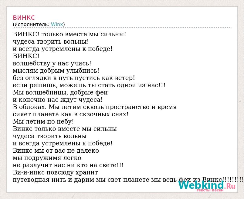 ВИНКС! только вместе мы сильны! чудеса творить вольны! и всегда устремлены к победе! ВИНКС! волшебству у нас учись! мыслям добрым улыбнись! без оглядки в путь пустись как ветер! если решишь, можешь ты стать одной из нас!!! Мы волшебницы, добрые феи и конечно нас ждут чудеса! В облоках. Мы летим сквозь пространство и время сияет планета как в скзочных снах! Мы летим по небу! Винкс только вместе мы сильны чудеса творить вольны и всегда устремлены к победе! Винкс мы от вас не далеко мы подружимя легко не разлучит нас ни кто на свете!!! Ви-и-инкс повсюду хранит путеводная нить и дарим мы свет планете мы ведь феи из Винкс!!!!!!!!!