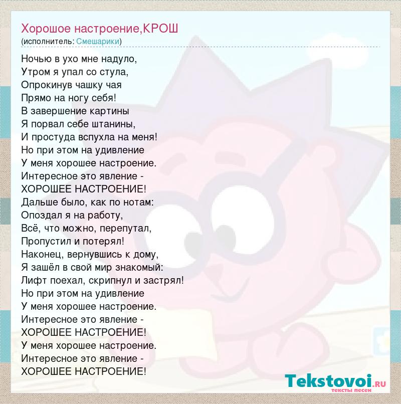 Ночью в ухо мне надуло, Утром я упал со стула, Опрокинув чашку чая Прямо на ногу себя! В завершение картины Я порвал себе штанины, И простуда вспухла на меня! Но при этом на удивление У меня хорошее настроение. Интересное это явление - ХОРОШЕЕ НАСТРОЕНИЕ! Дальше было, как по нотам: Опоздал я на работу, Всё, что можно, перепутал, Пропустил и потерял! Наконец, вернувшись к дому, Я зашёл в свой мир знакомый: Лифт поехал, скрипнул и застрял! Но при этом на удивление У меня хорошее настроение. Интересное это явление - ХОРОШЕЕ НАСТРОЕНИЕ! У меня хорошее настроение. Интересное это явление - ХОРОШЕЕ НАСТРОЕНИЕ!