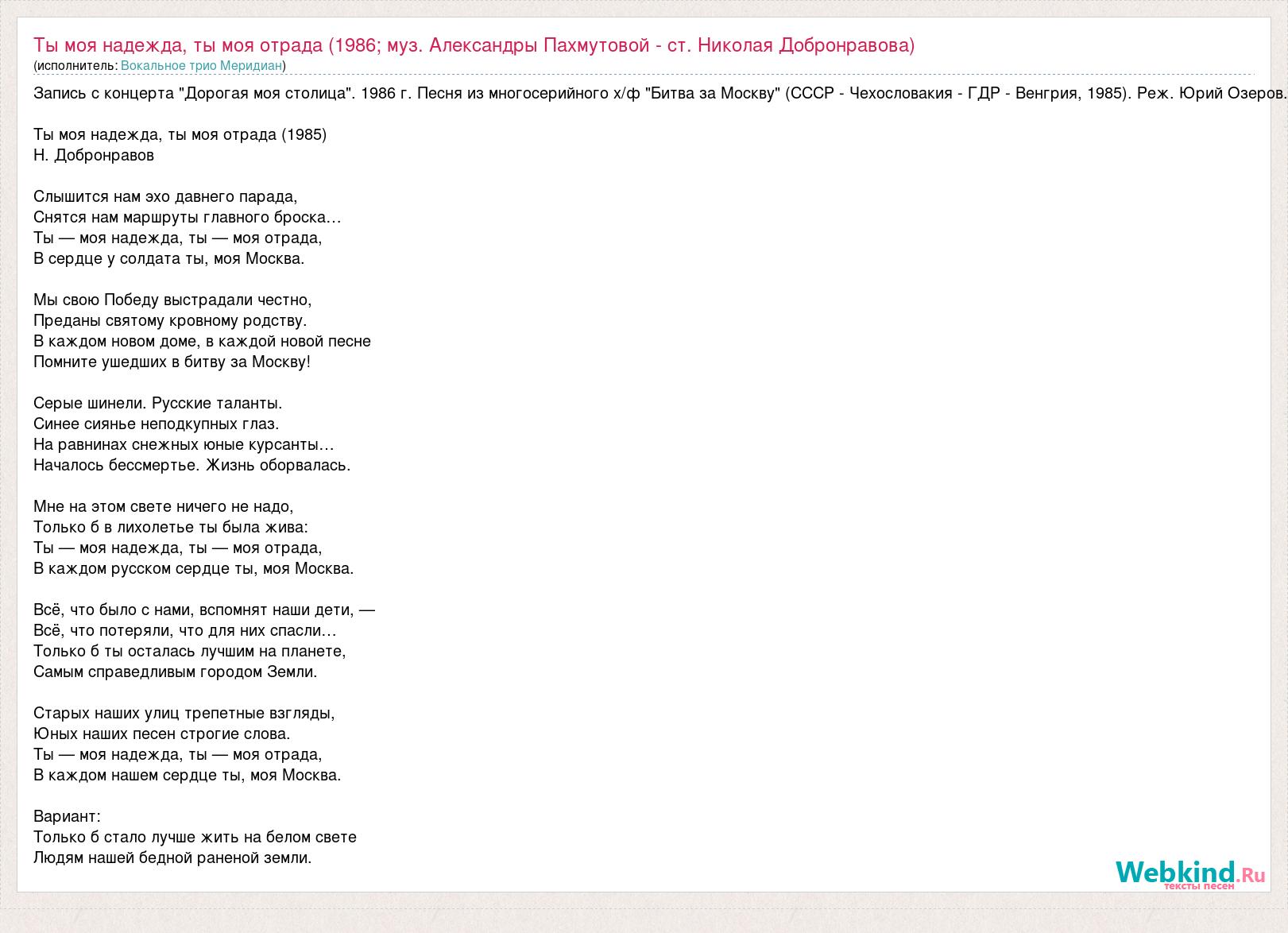 Запись с концерта "Дорогая моя столица". 1986 г. Песня из многосерийного х/ф "Битва за Москву" (СССР - Чехословакия - ГДР - Венгрия, 1985). Реж. Юрий Озеров. Ты моя надежда, ты моя отрада (1985) Н. Добронравов Слышится нам эхо давнего парада, Снятся нам маршруты главного броска… Ты — моя надежда, ты — моя отрада, В сердце у солдата ты, моя Москва. Мы свою Победу выстрадали честно, Преданы святому кровному родству. В каждом новом доме, в каждой новой песне Помните ушедших в битву за Москву! Серые шинели. Русские таланты. Синее сиянье неподкупных глаз. На равнинах снежных юные курсанты… Началось бессмертье. Жизнь оборвалась. Мне на этом свете ничего не надо, Только б в лихолетье ты была жива: Ты — моя надежда, ты — моя отрада, В каждом русском сердце ты, моя Москва. Всё, что было с нами, вспомнят наши дети, — Всё, что потеряли, что для них спасли… Только б ты осталась лучшим на планете, Самым справедливым городом Земли. Старых наших улиц трепетные взгляды, Юных наших песен строгие слова. Ты — моя надежда, ты — моя отрада, В каждом нашем сердце ты, моя Москва. Вариант: Только б стало лучше жить на белом свете Людям нашей бедной раненой земли.