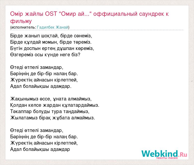 Бірде жанып шоқтай, бірде сөнеміз, Бірде құлдай момын, бірде төреміз. Бүгін доспын ертең дұшпан көреміз, Өзгереміз осы күнде неге біз? Өтеді өтпелі замандар, Бәріңнің де бір-бір налаң бар. Жүректің айнасын кірлетпей, Адал болайықшы адамдар. Жақынымыз өссе, ұната алмаймыз, Қолдан келсе жардан құлатардаймыз. Тәкаппар болуды тура таңдаймыз, Жылатамыз бірақ жұбата алмаймыз. Өтеді өтпелі замандар, Бәріңнің де бір-бір налаң бар. Жүректің айнасын кірлетпей, Адал болайықшы адамдар