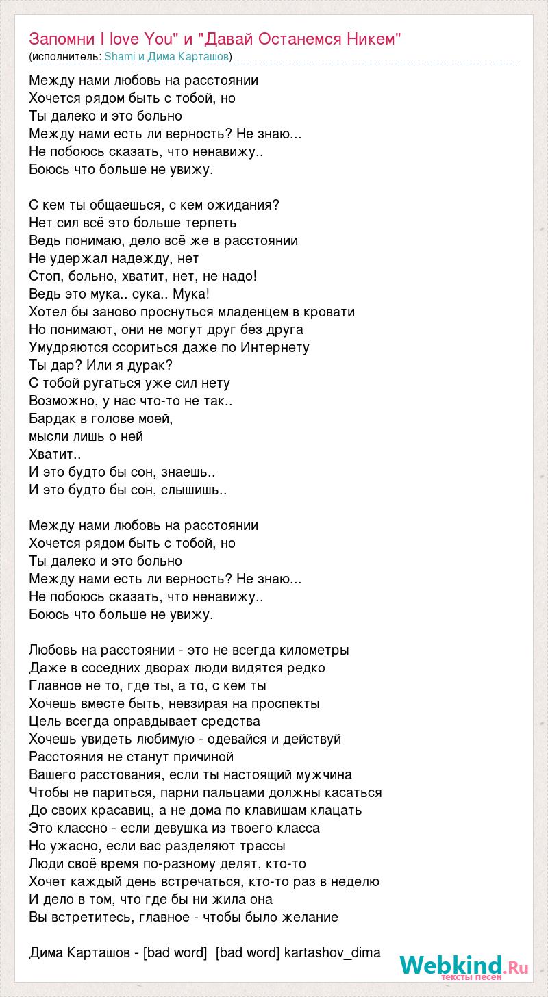 Между нами любовь на расстоянии Хочется рядом быть с тобой, но Ты далеко и это больно Между нами есть ли верность? Не знаю... Не побоюсь сказать, что ненавижу.. Боюсь что больше не увижу. С кем ты общаешься, с кем ожидания? Нет сил всё это больше терпеть Ведь понимаю, дело всё же в расстоянии Не удержал надежду, нет Стоп, больно, хватит, нет, не надо! Ведь это мука.. сука.. Мука! Хотел бы заново проснуться младенцем в кровати Но понимают, они не могут друг без друга Умудряются ссориться даже по Интернету Ты дар? Или я дурак? С тобой ругаться уже сил нету Возможно, у нас что-то не так.. Бардак в голове моей, мысли лишь о ней Хватит.. И это будто бы сон, знаешь.. И это будто бы сон, слышишь.. Между нами любовь на расстоянии Хочется рядом быть с тобой, но Ты далеко и это больно Между нами есть ли верность? Не знаю... Не побоюсь сказать, что ненавижу.. Боюсь что больше не увижу. Любовь на расстоянии - это не всегда километры Даже в соседних дворах люди видятся редко Главное не то, где ты, а то, с кем ты Хочешь вместе быть, невзирая на проспекты Цель всегда оправдывает средства Хочешь увидеть любимую - одевайся и действуй Расстояния не станут причиной Вашего расстования, если ты настоящий мужчина Чтобы не париться, парни пальцами должны касаться До своих красавиц, а не дома по клавишам клацать Это классно - если девушка из твоего класса Но ужасно, если вас разделяют трассы Люди своё время по-разному делят, кто-то Хочет каждый день встречаться, кто-то раз в неделю И дело в том, что где бы ни жила она Вы встретитесь, главное - чтобы было желание Дима Карташов - [bad word] [bad word] kartashov_dima