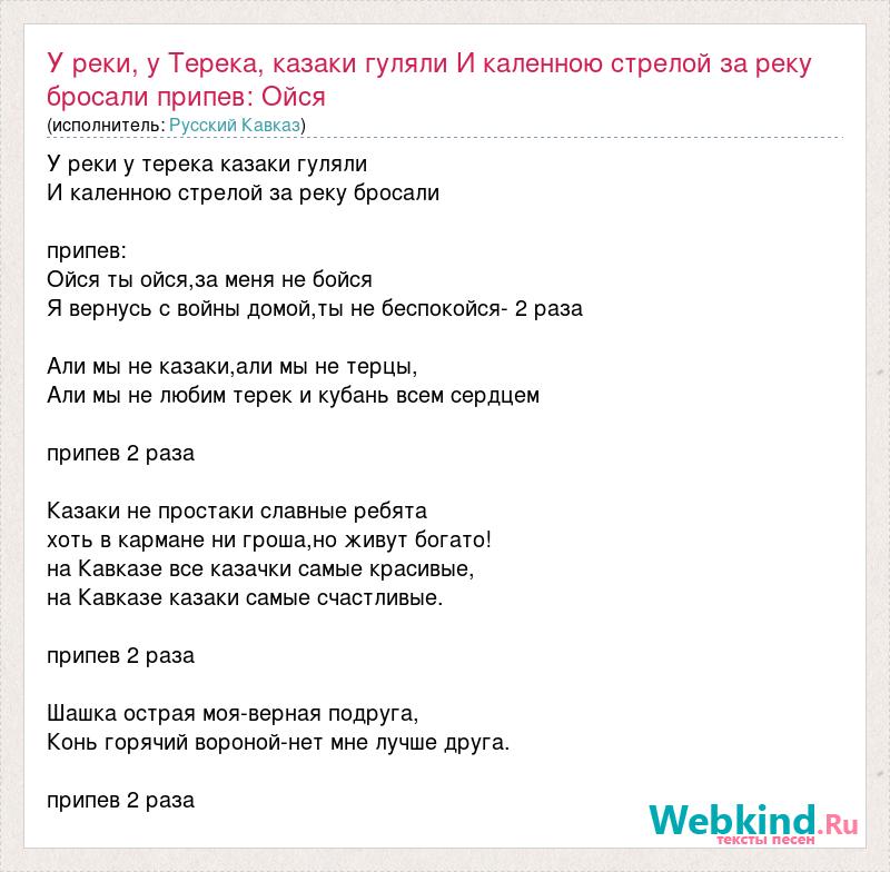 У реки у терека казаки гуляли И каленною стрелой за реку бросали припев: Ойся ты ойся,за меня не бойся Я вернусь с войны домой,ты не беспокойся- 2 раза Али мы не казаки,али мы не терцы, Али мы не любим терек и кубань всем сердцем припев 2 раза Казаки не простаки славные ребята хоть в кармане ни гроша,но живут богато! на Кавказе все казачки самые красивые, на Кавказе казаки самые счастливые. припев 2 раза Шашка острая моя-верная подруга, Конь горячий вороной-нет мне лучше друга. припев 2 раза