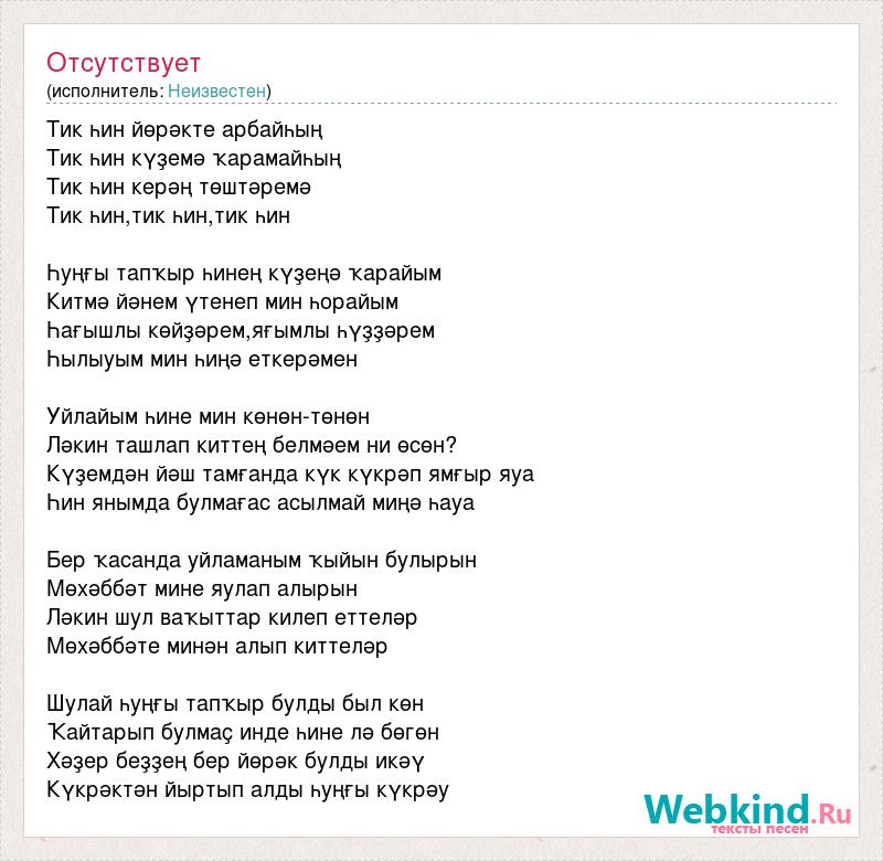 Тик һин йөрәкте арбайһың Тик һин күҙемә ҡарамайһың Тик һин керәң төштәремә Тик һин,тик һин,тик һин Һуңғы тапҡыр һинең күҙеңә ҡарайым Китмә йәнем үтенеп мин һорайым Һағышлы көйҙәрем,яғымлы һүҙҙәрем Һылыуым мин һиңә еткерәмен Уйлайым һине мин көнөн-төнөн Ләкин ташлап киттең белмәем ни өсөн? Күҙемдән йәш тамғанда күк күкрәп ямғыр яуа Һин янымда булмағас асылмай миңә һауа Бер ҡасанда уйламаным ҡыйын булырын Мөхәббәт мине яулап алырын Ләкин шул ваҡыттар килеп еттеләр Мөхәббәте минән алып киттеләр Шулай һуңғы тапҡыр булды был көн Ҡайтарып булмаҫ инде һине лә бөгөн Хәҙер беҙҙең бер йөрәк булды икәү Күкрәктән йыртып алды һуңғы күкрәу