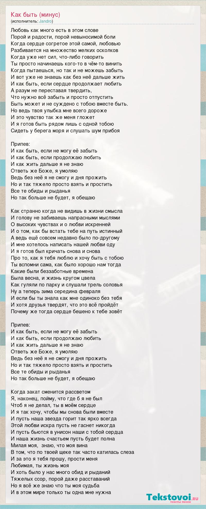 Любовь как много есть в этом слове Порой и радости, порой невыносимой боли Когда сердце согретое этой самой, любовью Разбивается на множество мелких осколков Когда уже нет сил, что-либо говорить Ты просто начинаешь кого-то в чём-то винить Когда пытаешься, но так и не можешь забыть И вот уже не знаешь как без неё дальше жить И как быть, если сердце продолжает любить А разум не переставая твердить, Что нужно всё забыть и просто отпустить Быть может и не суждено с тобою вместе быть. Но ведь твоя улыбка мне всего дороже И это чувство так же меня гложет И я готов быть рядом лишь с одной тобою Сидеть у берега моря и слушать шум прибоя Припев: И как быть, если не могу её забыть И как быть, если продолжаю любить И как жить дальше я не знаю Ответь же Боже, я умоляю Ведь без неё я не смогу и дня прожить Но и так тяжело просто взять и простить Все те обиды и рыданья Но так больше не будет, я обещаю Как странно когда не видишь в жизни смысла И голову не забиваешь напрасными мыслями О высоких чувствах и о любви искренней И о том, как бы встать тебе на путь истинный А ведь ещё совсем недавно было по-другому И мне хотелось написать нашей любви оду И я готов был кричать снова и снова Про то, как я тебя люблю и хочу быть с тобою Ты вспомни сама, как было хорошо нам тогда Какие были беззаботные времена Была весна, и жизнь кругом цвела Как гуляли по парку и слушали трель соловья Ну а теперь зима середина февраля И если бы ты знала как мне одиноко без тебя И хотя друзья твердят, что это всё пройдёт Почему же тогда сердце бешено к тебе зовёт Припев: И как быть, если не могу её забыть И как быть, если продолжаю любить И как жить дальше я не знаю Ответь же Боже, я умоляю Ведь без неё я не смогу и дня прожить Но и так тяжело просто взять и простить Все те обиды и рыданья Но так больше не будет, я обещаю Когда закат сменится рассветом Я, наконец, пойму, что где б я не был Чтоб я не делал, ты в моём сердце И я так хочу, чтобы мы снова были вместе И пусть наша звезда горит так ярко всегда Этой любви искра пусть не гаснет никогда И пусть бьются в унисон наши с тобой сердца И наша жизнь счастьем пусть будет полна Милая моя, знаю, что моя вина В том, что по твоей щеке так часто катилась слеза И за это я тебя прошу, прости меня Любимая, ты жизнь моя И хоть было у нас много обид и рыданий Тяжелых ссор, порой даже расставаний Но я всё же знаю что ты моя судьба И в этом мире только ты одна мне нужна