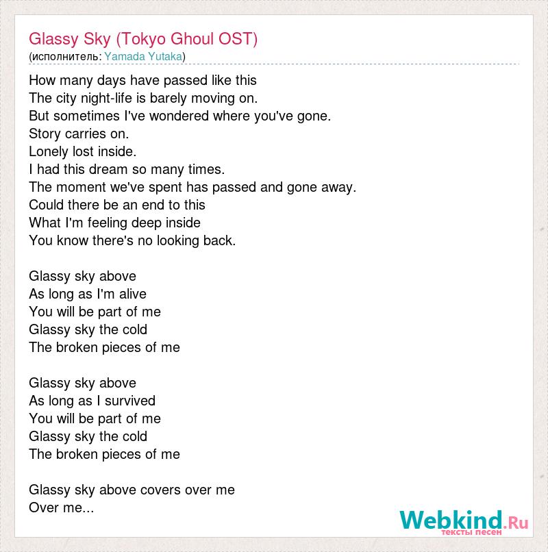 How many days have passed like this The city night-life is barely moving on. But sometimes I've wondered where you've gone. Story carries on. Lonely lost inside. I had this dream so many times. The moment we've spent has passed and gone away. Could there be an end to this What I'm feeling deep inside You know there's no looking back. Glassy sky above As long as I'm alive You will be part of me Glassy sky the cold The broken pieces of me Glassy sky above As long as I survived You will be part of me Glassy sky the cold The broken pieces of me Glassy sky above covers over me Over me...