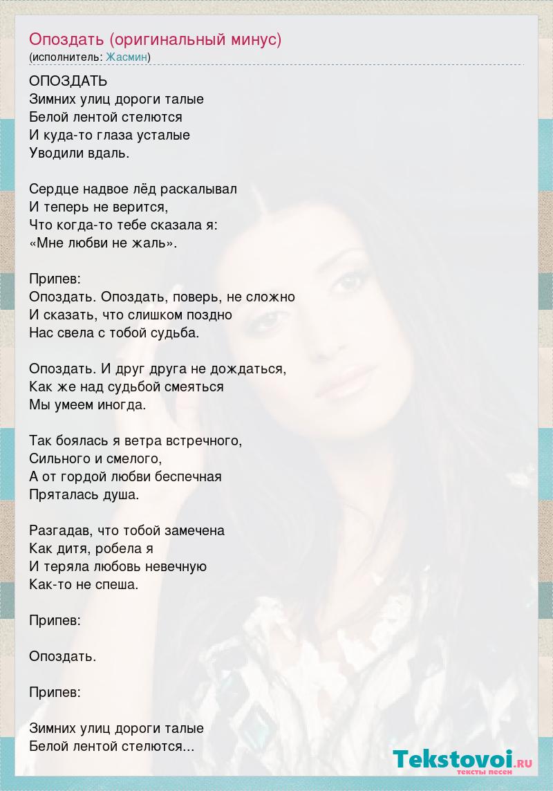 ОПОЗДАТЬ Зимних улиц дороги талые Белой лентой стелются И куда-то глаза усталые Уводили вдаль. Сердце надвое лёд раскалывал И теперь не верится, Что когда-то тебе сказала я: «Мне любви не жаль». Припев: Опоздать. Опоздать, поверь, не сложно И сказать, что слишком поздно Нас свела с тобой судьба. Опоздать. И друг друга не дождаться, Как же над судьбой смеяться Мы умеем иногда. Так боялась я ветра встречного, Сильного и смелого, А от гордой любви беспечная Пряталась душа. Разгадав, что тобой замечена Как дитя, робела я И теряла любовь невечную Как-то не спеша. Припев: Опоздать. Припев: Зимних улиц дороги талые Белой лентой стелются...