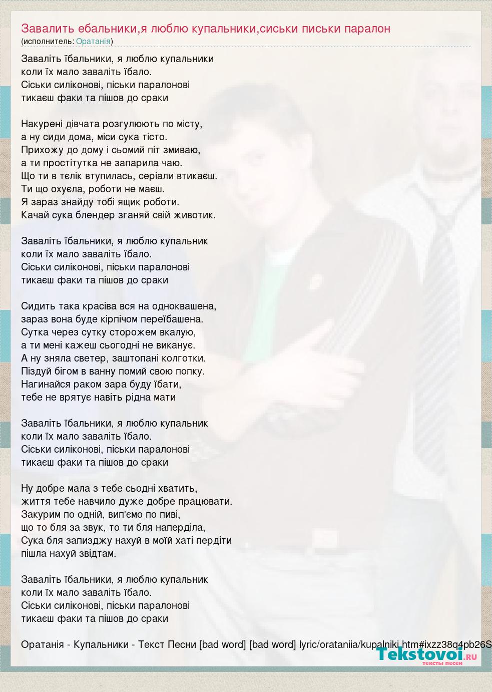 Заваліть їбальники, я люблю купальники коли їх мало заваліть їбало. Сіськи силіконові, піськи паралонові тикаєш факи та пішов до сраки Накурені дівчата розгулюють по місту, а ну сиди дома, міси сука тісто. Прихожу до дому і сьомий піт змиваю, а ти простітутка не запарила чаю. Що ти в тєлік втупилась, серіали втикаєш. Ти що охуєла, роботи не маєш. Я зараз знайду тобі ящик роботи. Качай сука блендер зганяй свій животик. Заваліть їбальники, я люблю купальник коли їх мало заваліть їбало. Сіськи силіконові, піськи паралонові тикаєш факи та пішов до сраки Сидить така красіва вся на одноквашена, зараз вона буде кірпічом переїбашена. Сутка через сутку сторожем вкалую, а ти мені кажеш сьогодні не виканує. А ну зняла светер, заштопані колготки. Піздуй бігом в ванну помий свою попку. Нагинайся раком зара буду їбати, тебе не врятує навіть рідна мати Заваліть їбальники, я люблю купальник коли їх мало заваліть їбало. Сіськи силіконові, піськи паралонові тикаєш факи та пішов до сраки Ну добре мала з тебе сьодні хватить, життя тебе навчило дуже добре працювати. Закурим по одній, вип'ємо по пиві, що то бля за звук, то ти бля наперділа, Сука бля запизджу нахуй в моїй хаті пердіти пішла нахуй звідтам. Заваліть їбальники, я люблю купальник коли їх мало заваліть їбало. Сіськи силіконові, піськи паралонові тикаєш факи та пішов до сраки Оратанія - Купальники - Текст Песни [bad word] [bad word] lyric/orataniia/kupalniki.htm#ixzz38q4pb26S