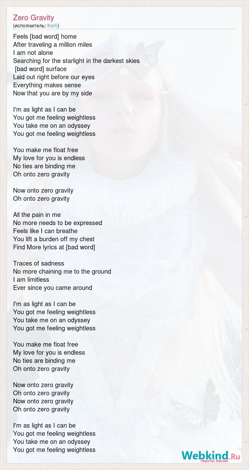 Feels [bad word] home After traveling a million miles I am not alone Searching for the starlight in the darkest skies [bad word] surface Laid out right before our eyes Everything makes sense Now that you are by my side I'm as light as I can be You got me feeling weightless You take me on an odyssey You got me feeling weightless You make me float free My love for you is endless No ties are binding me Oh onto zero gravity Now onto zero gravity Oh onto zero gravity All the pain in me No more needs to be expressed Feels like I can breathe You lift a burden off my chest Find More lyrics at [bad word] Traces of sadness No more chaining me to the ground I am limitless Ever since you came around I'm as light as I can be You got me feeling weightless You take me on an odyssey You got me feeling weightless You make me float free My love for you is endless No ties are binding me Oh onto zero gravity Now onto zero gravity Oh onto zero gravity Now onto zero gravity Oh onto zero gravity I'm as light as I can be You got me feeling weightless You take me on an odyssey You got me feeling weightless