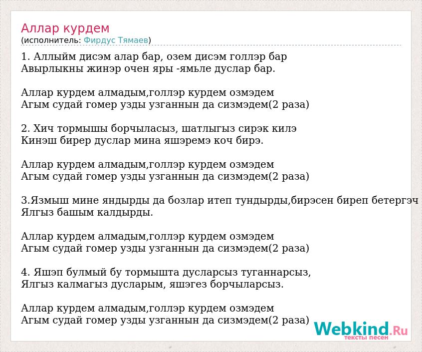 1. Аллыйм дисэм алар бар, озем дисэм голлэр бар Авырлыкны жинэр очен яры -ямьле дуслар бар. Аллар курдем алмадым,голлэр курдем озмэдем Агым судай гомер узды узганнын да сизмэдем(2 раза) 2. Хич тормышы борчыласыз, шатлыгыз сирэк килэ Кинэш бирер дуслар мина яшэремэ коч бирэ. Аллар курдем алмадым,голлэр курдем озмэдем Агым судай гомер узды узганнын да сизмэдем(2 раза) 3.Язмыш мине яндырды да бозлар итеп тундырды,бирэсен биреп бетергэч Ялгыз башым калдырды. Аллар курдем алмадым,голлэр курдем озмэдем Агым судай гомер узды узганнын да сизмэдем(2 раза) 4. Яшэп булмый бу тормышта дусларсыз туганнарсыз, Ялгыз калмагыз дусларым, яшэгез борчыларсыз. Аллар курдем алмадым,голлэр курдем озмэдем Агым судай гомер узды узганнын да сизмэдем(2 раза)