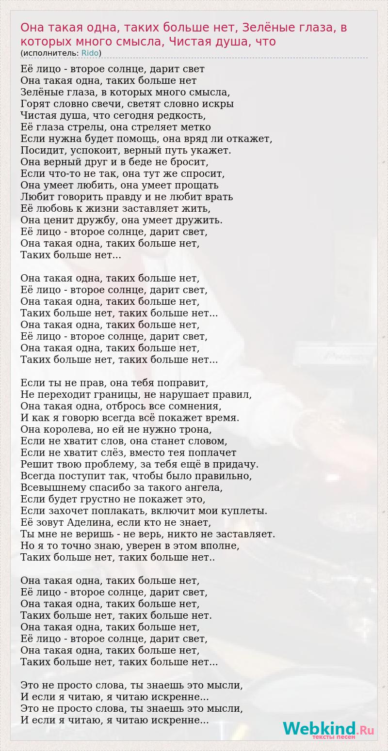 Её лицо - второе солнце, дарит свет Она такая одна, таких больше нет Зелёные глаза, в которых много смысла, Горят словно свечи, светят словно искры Чистая душа, что сегодня редкость, Её глаза стрелы, она стреляет метко Если нужна будет помощь, она вряд ли откажет, Посидит, успокоит, верный путь укажет. Она верный друг и в беде не бросит, Если что-то не так, она тут же спросит, Она умеет любить, она умеет прощать Любит говорить правду и не любит врать Её любовь к жизни заставляет жить, Она ценит дружбу, она умеет дружить. Её лицо - второе солнце, дарит свет, Она такая одна, таких больше нет, Таких больше нет... Она такая одна, таких больше нет, Её лицо - второе солнце, дарит свет, Она такая одна, таких больше нет, Таких больше нет, таких больше нет... Она такая одна, таких больше нет, Её лицо - второе солнце, дарит свет, Она такая одна, таких больше нет, Таких больше нет, таких больше нет... Если ты не прав, она тебя поправит, Не переходит границы, не нарушает правил, Она такая одна, отбрось все сомнения, И как я говорю всегда всё покажет время. Она королева, но ей не нужно трона, Если не хватит слов, она станет словом, Если не хватит слёз, вместо тея поплачет Решит твою проблему, за тебя ещё в придачу. Всегда поступит так, чтобы было правильно, Всевышнему спасибо за такого ангела, Если будет грустно не покажет это, Если захочет поплакать, включит мои куплеты. Её зовут Аделина, если кто не знает, Ты мне не веришь - не верь, никто не заставляет. Но я то точно знаю, уверен в этом вполне, Таких больше нет, таких больше нет.. Она такая одна, таких больше нет, Её лицо - второе солнце, дарит свет, Она такая одна, таких больше нет, Таких больше нет, таких больше нет. Она такая одна, таких больше нет, Её лицо - второе солнце, дарит свет, Она такая одна, таких больше нет, Таких больше нет, таких больше нет... Это не просто слова, ты знаешь это мысли, И если я читаю, я читаю искренне... Это не просто слова, ты знаешь это мысли, И если я читаю, я читаю искренне...