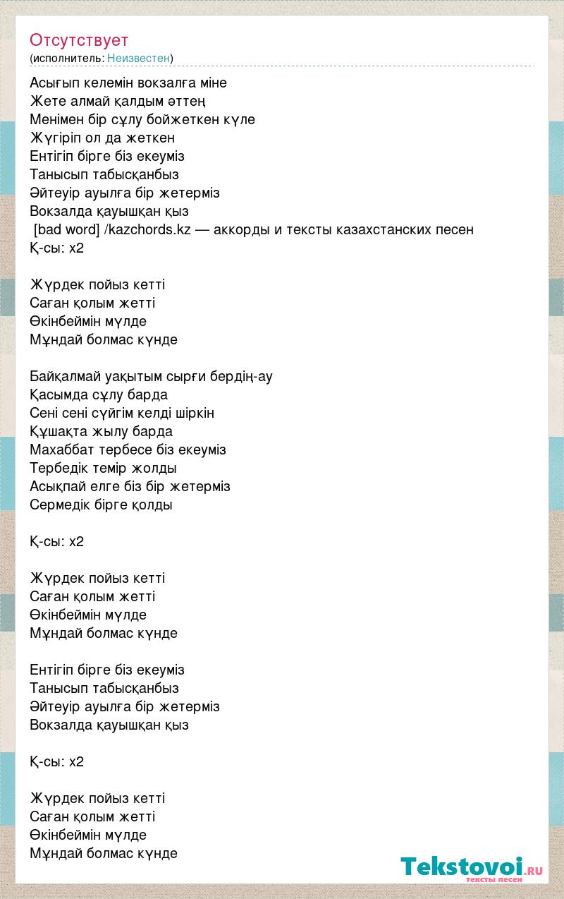 Асығып келемін вокзалға міне Жете алмай қалдым әттең Менімен бір сұлу бойжеткен күле Жүгіріп ол да жеткен Ентігіп бірге біз екеуміз Танысып табысқанбыз Әйтеуір ауылға бір жетерміз Вокзалда қауышқан қыз [bad word] /kazchords.kz — аккорды и тексты казахстанских песен Қ-сы: х2 Жүрдек пойыз кетті Саған қолым жетті Өкінбеймін мүлде Мұндай болмас күнде Байқалмай уақытым сырғи бердің-ау Қасымда сұлу барда Сені сені сүйгім келді шіркін Құшақта жылу барда Махаббат тербесе біз екеуміз Тербедік темір жолды Асықпай елге біз бір жетерміз Сермедік бірге қолды Қ-сы: х2 Жүрдек пойыз кетті Саған қолым жетті Өкінбеймін мүлде Мұндай болмас күнде Ентігіп бірге біз екеуміз Танысып табысқанбыз Әйтеуір ауылға бір жетерміз Вокзалда қауышқан қыз Қ-сы: х2 Жүрдек пойыз кетті Саған қолым жетті Өкінбеймін мүлде Мұндай болмас күнде