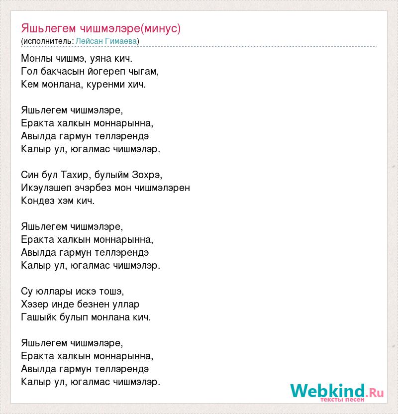 Монлы чишмэ, уяна кич. Гол бакчасын йогереп чыгам, Кем монлана, куренми хич. Яшьлегем чишмэлэре, Еракта халкын моннарынна, Авылда гармун теллэрендэ Калыр ул, югалмас чишмэлэр. Син бул Тахир, булыйм Зохрэ, Икэулэшеп эчэрбез мон чишмэлэрен Кондез хэм кич. Яшьлегем чишмэлэре, Еракта халкын моннарынна, Авылда гармун теллэрендэ Калыр ул, югалмас чишмэлэр. Су юллары искэ тошэ, Хэзер инде безнен уллар Гашыйк булып монлана кич. Яшьлегем чишмэлэре, Еракта халкын моннарынна, Авылда гармун теллэрендэ Калыр ул, югалмас чишмэлэр.