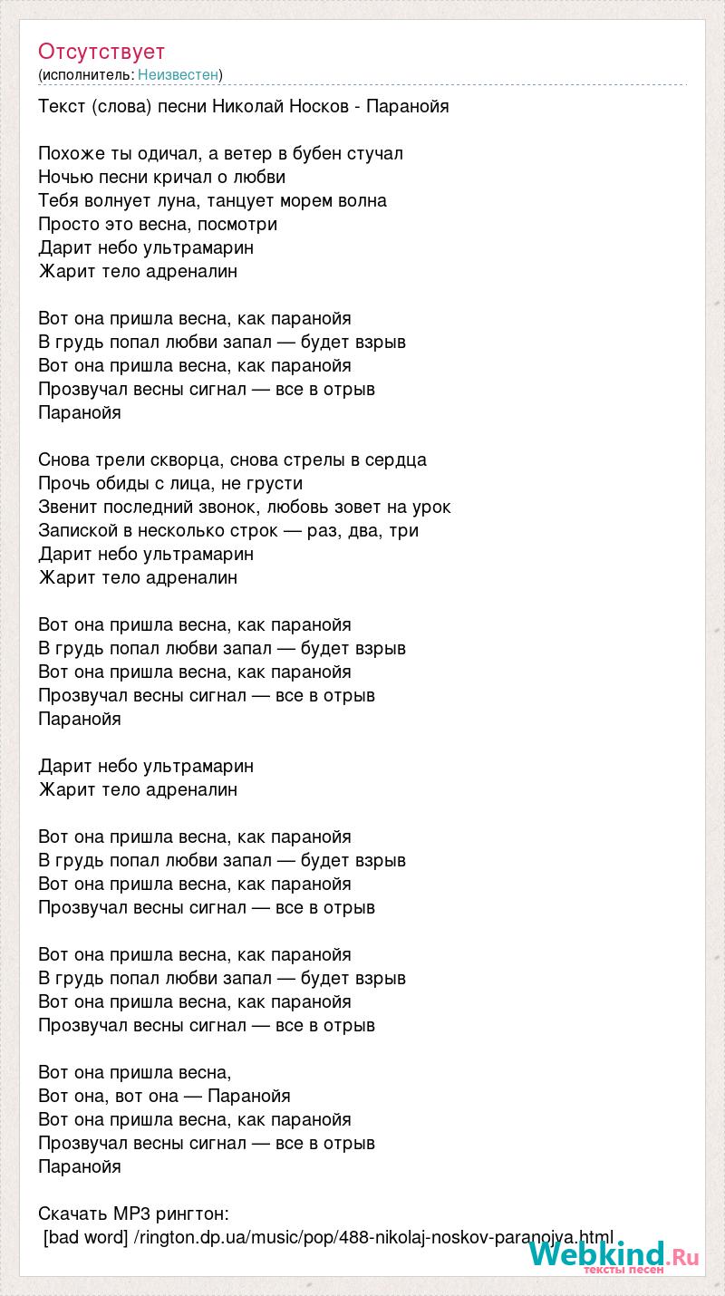Текст (слова) песни Николай Носков - Паранойя Похоже ты одичал, а ветер в бубен стучал Ночью песни кричал о любви Тебя волнует луна, танцует морем волна Просто это весна, посмотри Дарит небо ультрамарин Жарит тело адреналин Вот она пришла весна, как паранойя В грудь попал любви запал — будет взрыв Вот она пришла весна, как паранойя Прозвучал весны сигнал — все в отрыв Паранойя Снова трели скворца, снова стрелы в сердца Прочь обиды с лица, не грусти Звенит последний звонок, любовь зовет на урок Запиской в несколько строк — раз, два, три Дарит небо ультрамарин Жарит тело адреналин Вот она пришла весна, как паранойя В грудь попал любви запал — будет взрыв Вот она пришла весна, как паранойя Прозвучал весны сигнал — все в отрыв Паранойя Дарит небо ультрамарин Жарит тело адреналин Вот она пришла весна, как паранойя В грудь попал любви запал — будет взрыв Вот она пришла весна, как паранойя Прозвучал весны сигнал — все в отрыв Вот она пришла весна, как паранойя В грудь попал любви запал — будет взрыв Вот она пришла весна, как паранойя Прозвучал весны сигнал — все в отрыв Вот она пришла весна, Вот она, вот она — Паранойя Вот она пришла весна, как паранойя Прозвучал весны сигнал — все в отрыв Паранойя Скачать MP3 рингтон: [bad word] /rington.dp.ua/music/pop/488-nikolaj-noskov-paranojya.html