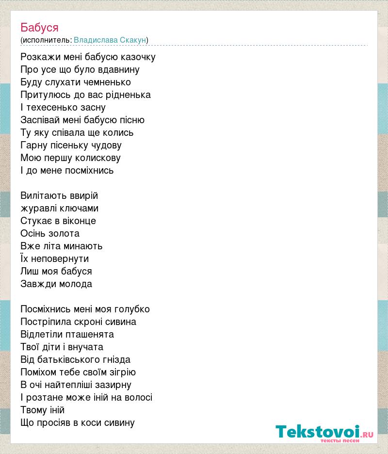 Розкажи мені бабусю казочку Про усе що було вдавнину Буду слухати чемненько Притулюсь до вас рідненька І техесенько засну Заспівай мені бабусю пісню Ту яку співала ще колись Гарну пісеньку чудову Мою першу колискову І до мене посміхнись Вилітають ввирій журавлі ключами Стукає в віконце Осінь золота Вже літа минають Їх неповернути Лиш моя бабуся Завжди молода Посміхнись мені моя голубко Постріпила скроні сивина Відлетіли пташенята Твої діти і внучата Від батьківського гнізда Поміхом тебе своїм зігрію В очі найтепліші зазирну І розтане може іній на волосі Твому іній Що просіяв в коси сивину
