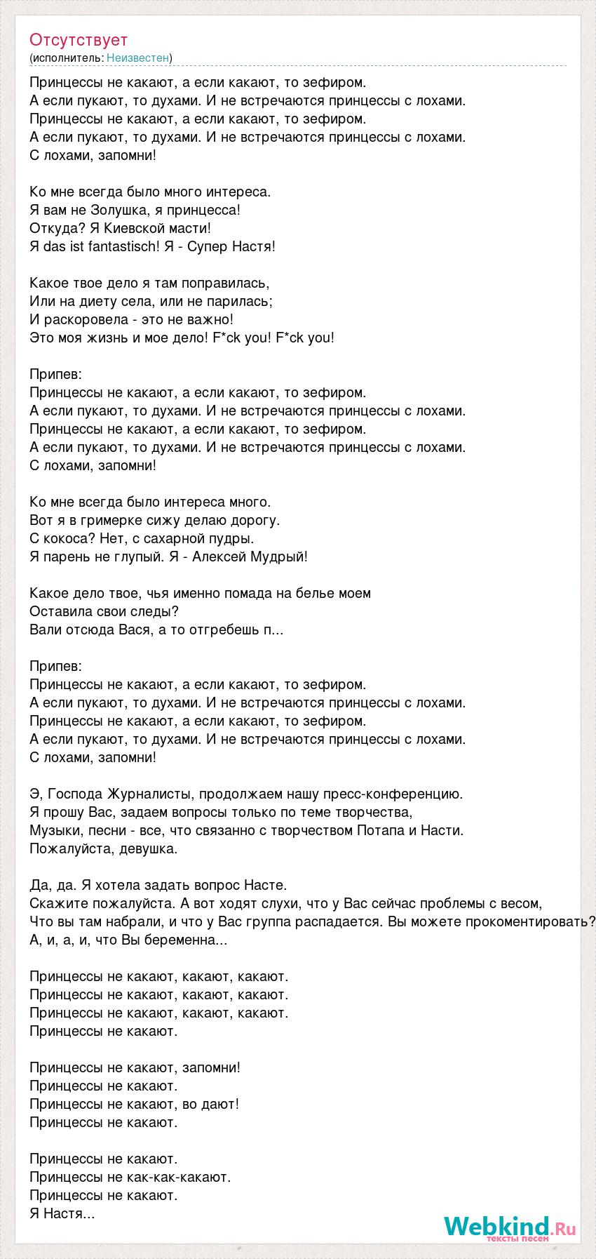 Принцессы не какают, а если какают, то зефиром. А если пукают, то духами. И не встречаются принцессы с лохами. Принцессы не какают, а если какают, то зефиром. А если пукают, то духами. И не встречаются принцессы с лохами. С лохами, запомни! Ко мне всегда было много интереса. Я вам не Золушка, я принцесса! Откуда? Я Киевской масти! Я das ist fantastisch! Я - Супер Настя! Какое твое дело я там поправилась, Или на диету села, или не парилась; И раскоровела - это не важно! Это моя жизнь и мое дело! F*ck you! F*ck you! Припев: Принцессы не какают, а если какают, то зефиром. А если пукают, то духами. И не встречаются принцессы с лохами. Принцессы не какают, а если какают, то зефиром. А если пукают, то духами. И не встречаются принцессы с лохами. С лохами, запомни! Ко мне всегда было интереса много. Вот я в гримерке сижу делаю дорогу. С кокоса? Нет, с сахарной пудры. Я парень не глупый. Я - Алексей Мудрый! Какое дело твое, чья именно помада на белье моем Оставила свои следы? Вали отсюда Вася, а то отгребешь п... Припев: Принцессы не какают, а если какают, то зефиром. А если пукают, то духами. И не встречаются принцессы с лохами. Принцессы не какают, а если какают, то зефиром. А если пукают, то духами. И не встречаются принцессы с лохами. С лохами, запомни! Э, Господа Журналисты, продолжаем нашу пресс-конференцию. Я прошу Вас, задаем вопросы только по теме творчества, Музыки, песни - все, что связанно с творчеством Потапа и Насти. Пожалуйста, девушка. Да, да. Я хотела задать вопрос Насте. Скажите пожалуйста. А вот ходят слухи, что у Вас сейчас проблемы с весом, Что вы там набрали, и что у Вас группа распадается. Вы можете прокоментировать? А, и, а, и, что Вы беременна... Принцессы не какают, какают, какают. Принцессы не какают, какают, какают. Принцессы не какают, какают, какают. Принцессы не какают. Принцессы не какают, запомни! Принцессы не какают. Принцессы не какают, во дают! Принцессы не какают. Принцессы не какают. Принцессы не как-как-какают. Принцессы не какают. Я Настя...