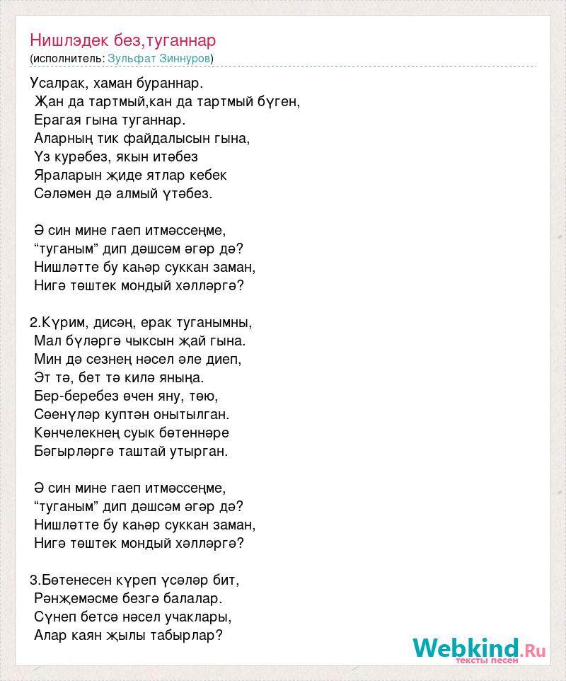 Усалрак, хаман бураннар. Җан да тартмый,кан да тартмый бүген, Ерагая гына туганнар. Аларның тик файдалысын гына, Үз курәбез, якын итәбез Яраларын җиде ятлар кебек Сәләмен дә алмый үтәбез. Ә син мине гаеп итмәссеңме, “туганым” дип дәшсәм әгәр дә? Нишләтте бу каһәр суккан заман, Нигә төштек мондый хәлләргә? 2.Күрим, дисәң, ерак туганымны, Мал бүләргә чыксын җай гына. Мин дә сезнең нәсел әле диеп, Эт тә, бет тә килә яныңа. Бер-беребез өчен яну, төю, Сөенүләр куптән онытылган. Көнчелекнең суык бөтеннәре Бәгырләргә таштай утырган. Ә син мине гаеп итмәссеңме, “туганым” дип дәшсәм әгәр дә? Нишләтте бу каһәр суккан заман, Нигә төштек мондый хәлләргә? 3.Бөтенесен күреп үсәләр бит, Рәнҗемәсме безгә балалар. Сүнеп бетсә нәсел учаклары, Алар каян җылы табырлар?
