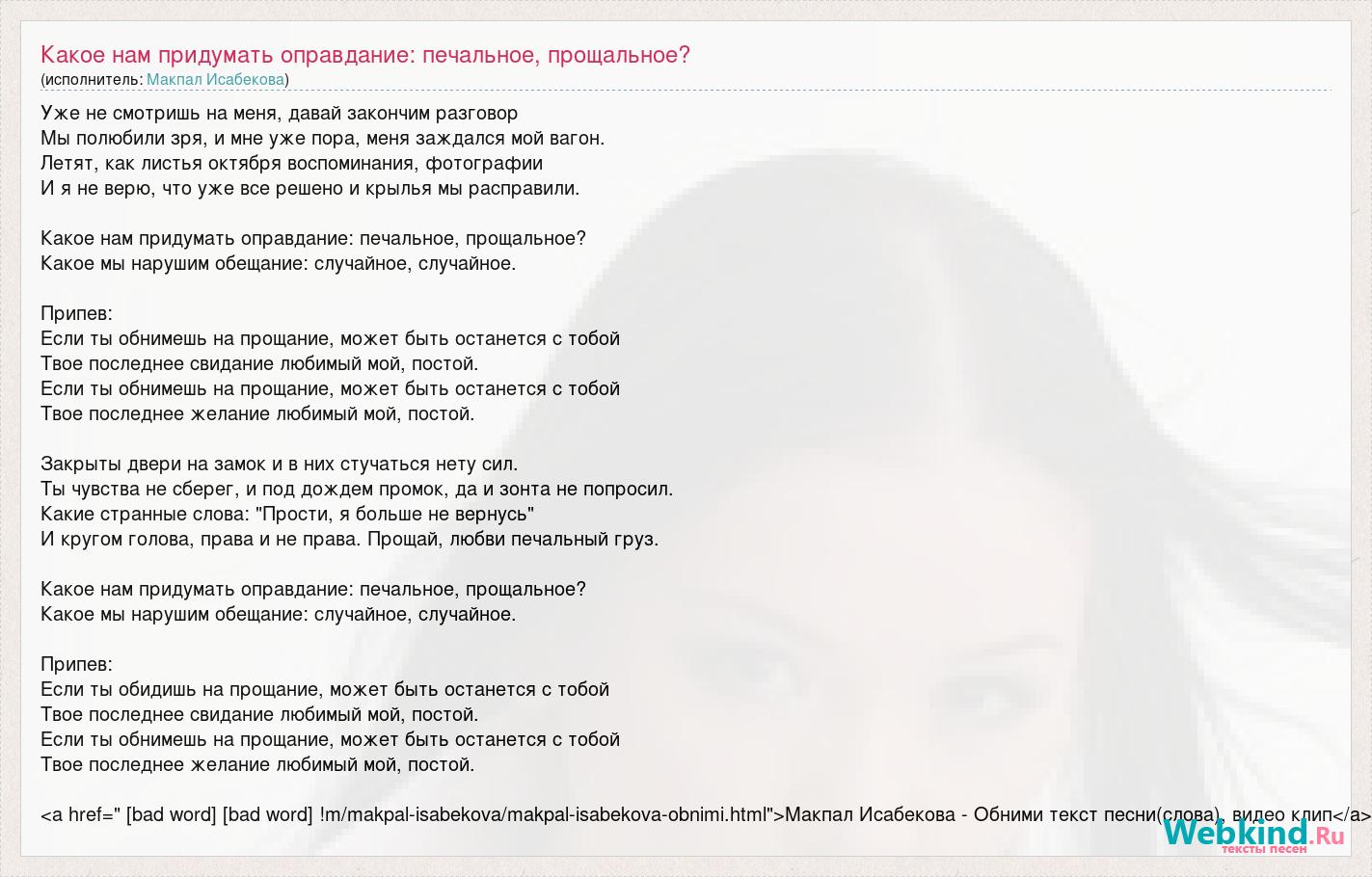 Уже не смотришь на меня, давай закончим разговор Мы полюбили зря, и мне уже пора, меня заждался мой вагон. Летят, как листья октября воспоминания, фотографии И я не верю, что уже все решено и крылья мы расправили. Какое нам придумать оправдание: печальное, прощальное? Какое мы нарушим обещание: случайное, случайное. Припев: Если ты обнимешь на прощание, может быть останется с тобой Твое последнее свидание любимый мой, постой. Если ты обнимешь на прощание, может быть останется с тобой Твое последнее желание любимый мой, постой. Закрыты двери на замок и в них стучаться нету сил. Ты чувства не сберег, и под дождем промок, да и зонта не попросил. Какие странные слова: "Прости, я больше не вернусь" И кругом голова, права и не права. Прощай, любви печальный груз. Какое нам придумать оправдание: печальное, прощальное? Какое мы нарушим обещание: случайное, случайное. Припев: Если ты обидишь на прощание, может быть останется с тобой Твое последнее свидание любимый мой, постой. Если ты обнимешь на прощание, может быть останется с тобой Твое последнее желание любимый мой, постой. <a href=" [bad word] [bad word] !m/makpal-isabekova/makpal-isabekova-obnimi.html">Макпал Исабекова - Обними текст песни(слова), видео клип</a>