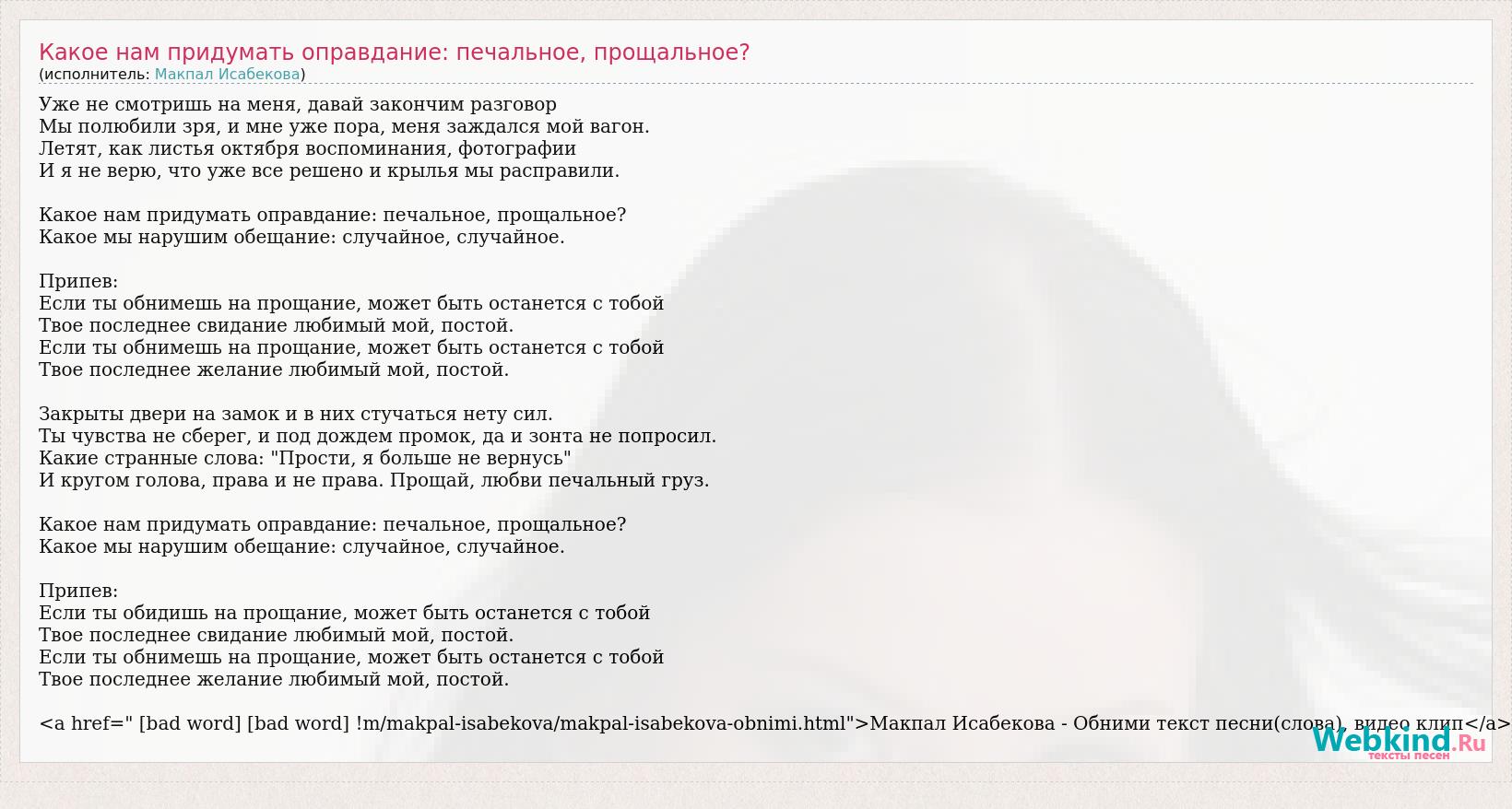 Уже не смотришь на меня, давай закончим разговор Мы полюбили зря, и мне уже пора, меня заждался мой вагон. Летят, как листья октября воспоминания, фотографии И я не верю, что уже все решено и крылья мы расправили. Какое нам придумать оправдание: печальное, прощальное? Какое мы нарушим обещание: случайное, случайное. Припев: Если ты обнимешь на прощание, может быть останется с тобой Твое последнее свидание любимый мой, постой. Если ты обнимешь на прощание, может быть останется с тобой Твое последнее желание любимый мой, постой. Закрыты двери на замок и в них стучаться нету сил. Ты чувства не сберег, и под дождем промок, да и зонта не попросил. Какие странные слова: "Прости, я больше не вернусь" И кругом голова, права и не права. Прощай, любви печальный груз. Какое нам придумать оправдание: печальное, прощальное? Какое мы нарушим обещание: случайное, случайное. Припев: Если ты обидишь на прощание, может быть останется с тобой Твое последнее свидание любимый мой, постой. Если ты обнимешь на прощание, может быть останется с тобой Твое последнее желание любимый мой, постой. <a href=" [bad word] [bad word] !m/makpal-isabekova/makpal-isabekova-obnimi.html">Макпал Исабекова - Обними текст песни(слова), видео клип</a>
