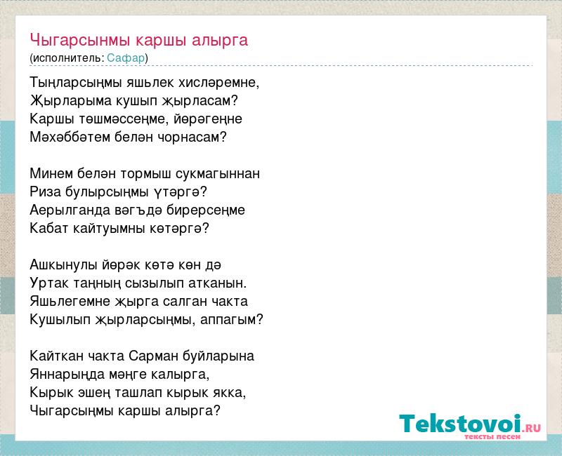 Тыңларсыңмы яшьлек хисләремне, Җырларыма кушып җырласам? Каршы төшмәссеңме, йөрәгеңне Мәхәббәтем белән чорнасам? Минем белән тормыш сукмагыннан Риза булырсыңмы үтәргә? Аерылганда вәгъдә бирерсеңме Кабат кайтуымны көтәргә? Ашкынулы йөрәк көтә көн дә Уртак таңның сызылып атканын. Яшьлегемне җырга салган чакта Кушылып җырларсыңмы, аппагым? Кайткан чакта Сарман буйларына Яннарыңда мәңге калырга, Кырык эшең ташлап кырык якка, Чыгарсыңмы каршы алырга?