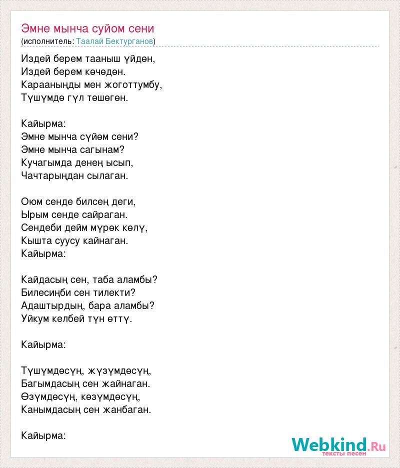 Издей берем тааныш үйдөн, Издей берем көчөдөн. Карааныңды мен жоготтумбу, Түшүмдө гүл төшөгөн. Кайырма: Эмне мынча сүйөм сени? Эмне мынча сагынам? Кучагымда денең ысып, Чачтарыңдан сылаган. Оюм сенде билсең деги, Ырым сенде сайраган. Сендеби дейм мүрөк көлү, Кышта суусу кайнаган. Кайырма: Кайдасың сен, таба аламбы? Билесиңби сен тилекти? Адаштырдың, бара аламбы? Уйкум келбей түн өттү. Кайырма: Түшүмдөсүң, жүзүмдөсүң, Багымдасың сен жайнаган. Өзүмдөсүң, көзүмдөсүң, Канымдасың сен жанбаган. Кайырма: