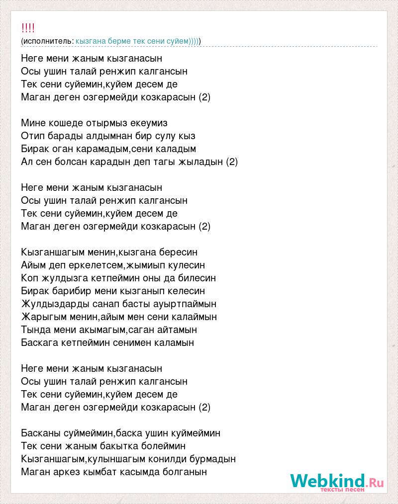 Неге мени жаным кызганасын Осы ушин талай ренжип калгансын Тек сени суйемин,куйем десем де Маган деген озгермейди козкарасын (2) Мине кошеде отырмыз екеумиз Отип барады алдымнан бир сулу кыз Бирак оган карамадым,сени каладым Ал сен болсан карадын деп тагы жыладын (2) Неге мени жаным кызганасын Осы ушин талай ренжип калгансын Тек сени суйемин,куйем десем де Маган деген озгермейди козкарасын (2) Кызганшагым менин,кызгана бересин Айым деп еркелетсем,жымиып кулесин Коп жулдызга кетпеймин оны да билесин Бирак барибир мени кызганып келесин Жулдыздарды санап басты ауыртпаймын Жарыгым менин,айым мен сени калаймын Тында мени акымагым,саган айтамын Баскага кетпеймин сенимен каламын Неге мени жаным кызганасын Осы ушин талай ренжип калгансын Тек сени суйемин,куйем десем де Маган деген озгермейди козкарасын (2) Басканы суймеймин,баска ушин куймеймин Тек сени жаным бакытка болеймин Кызганшагым,кулыншагым конилди бурмадын Маган аркез кымбат касымда болганын