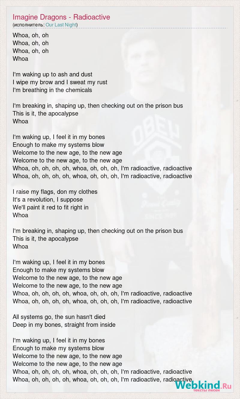 Whoa, oh, oh Whoa, oh, oh Whoa, oh, oh Whoa I'm waking up to ash and dust I wipe my brow and I sweat my rust I'm breathing in the chemicals I'm breaking in, shaping up, then checking out on the prison bus This is it, the apocalypse Whoa I'm waking up, I feel it in my bones Enough to make my systems blow Welcome to the new age, to the new age Welcome to the new age, to the new age Whoa, oh, oh, oh, oh, whoa, oh, oh, oh, I'm radioactive, radioactive Whoa, oh, oh, oh, oh, whoa, oh, oh, oh, I'm radioactive, radioactive I raise my flags, don my clothes It's a revolution, I suppose We'll paint it red to fit right in Whoa I'm breaking in, shaping up, then checking out on the prison bus This is it, the apocalypse Whoa I'm waking up, I feel it in my bones Enough to make my systems blow Welcome to the new age, to the new age Welcome to the new age, to the new age Whoa, oh, oh, oh, oh, whoa, oh, oh, oh, I'm radioactive, radioactive Whoa, oh, oh, oh, oh, whoa, oh, oh, oh, I'm radioactive, radioactive All systems go, the sun hasn't died Deep in my bones, straight from inside I'm waking up, I feel it in my bones Enough to make my systems blow Welcome to the new age, to the new age Welcome to the new age, to the new age Whoa, oh, oh, oh, oh, whoa, oh, oh, oh, I'm radioactive, radioactive Whoa, oh, oh, oh, oh, whoa, oh, oh, oh, I'm radioactive, radioactive