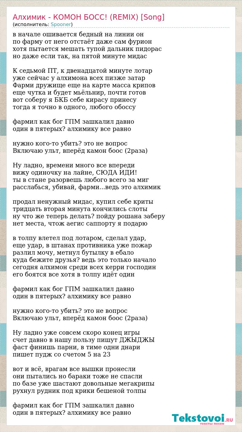 А как ты думаешь, о чем песня "Алхимик - КОМОН БОСС! (REMIX) [Song]" ?
