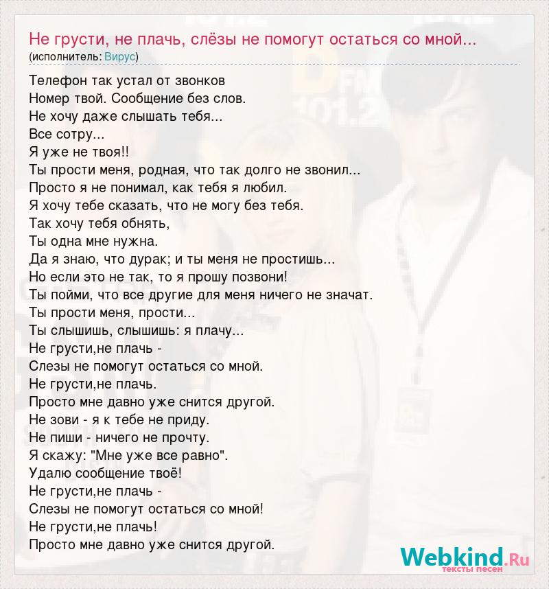 Телефон так устал от звонков Номер твой. Сообщение без слов. Не хочу даже слышать тебя... Все сотру... Я уже не твоя!! Ты прости меня, родная, что так долго не звонил... Просто я не понимал, как тебя я любил. Я хочу тебе сказать, что не могу без тебя. Так хочу тебя обнять, Ты одна мне нужна. Да я знаю, что дурак; и ты меня не простишь... Но если это не так, то я прошу позвони! Ты пойми, что все другие для меня ничего не значат. Ты прости меня, прости... Ты слышишь, слышишь: я плачу... Не грусти,не плачь - Слезы не помогут остаться со мной. Не грусти,не плачь. Просто мне давно уже снится другой. Не зови - я к тебе не приду. Не пиши - ничего не прочту. Я скажу: "Мне уже все равно". Удалю сообщение твоё! Не грусти,не плачь - Слезы не помогут остаться со мной! Не грусти,не плачь! Просто мне давно уже снится другой.