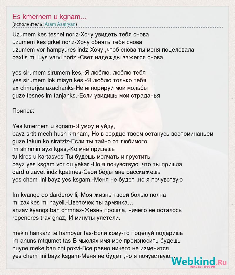 Uzumem kes tesnel noriz-Хочу увидеть тебя снова uzumem kes grkel noriz-Хочу обнять тебя снова uzumem vor hampyures indz-Хочу ,чтоб снова ты меня поцеловала baxtis mi luys varvi noriz,-Свет надежды зажегся снова yes sirumem sirumem kes,-Я люблю, люблю тебя yes sirumem lok miayn kes,-Я люблю только тебя ax chmerjes axachanks-Не игнорируй мои мольбы guze tesnes im tanjanks.-Если увидишь мои страданья Припев: Yes kmernem u kgnam-Я умру и уйду, bayz srtit mech hush kmnam,-Но в сердце твоем останусь воспоминаньем guze takun ko siratziz-Если ты тайно от любимого im shirimin ayzi kgas,-Ко мне придешь tu klres u kartasves-Ты будешь молчать и грустить bayz yes ksgam vor du yekar,-Но я почувствую ,что ты пришла dard u zavet indz kpatmes-Свои беды мне расскажешь yes chem lini bayz yes ksgam.-Меня не будет ,но я почувствую Im kyanqe qo darderov li,-Моя жизнь твоей болью полна mi zaxikes mi hayeli,-Цветочек ты армянка… anzav kyanqs ban chmnaz-Жизнь прошла, ничего не осталось ropeneres trav gnaz,-И минуты улетели. mekin hankarz te hampyur tas-Если кому-то поцелуй подаришь im anuns mtqumet tas-В мыслях имя мое произносить будешь nuyne meke ban chi poxvi-Все равно ничего не изменится yes chem lini bayz ksgam-Меня не будет ,но я почувствую...